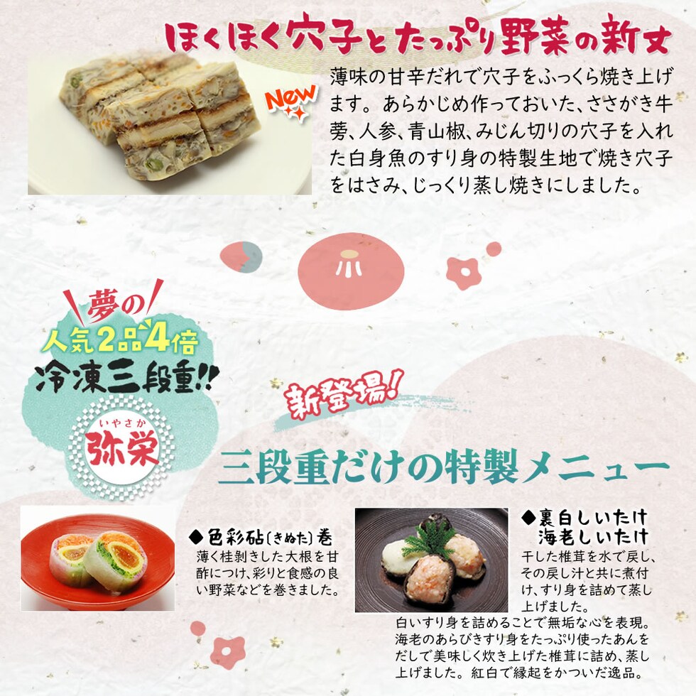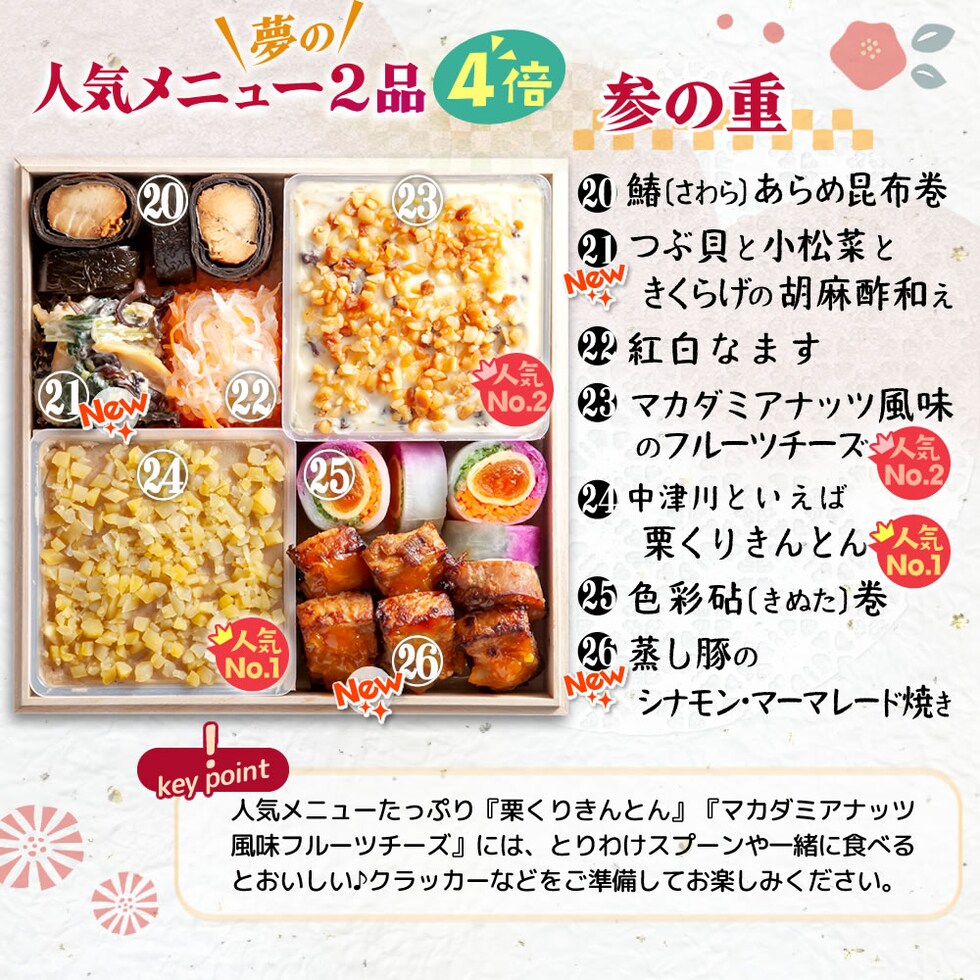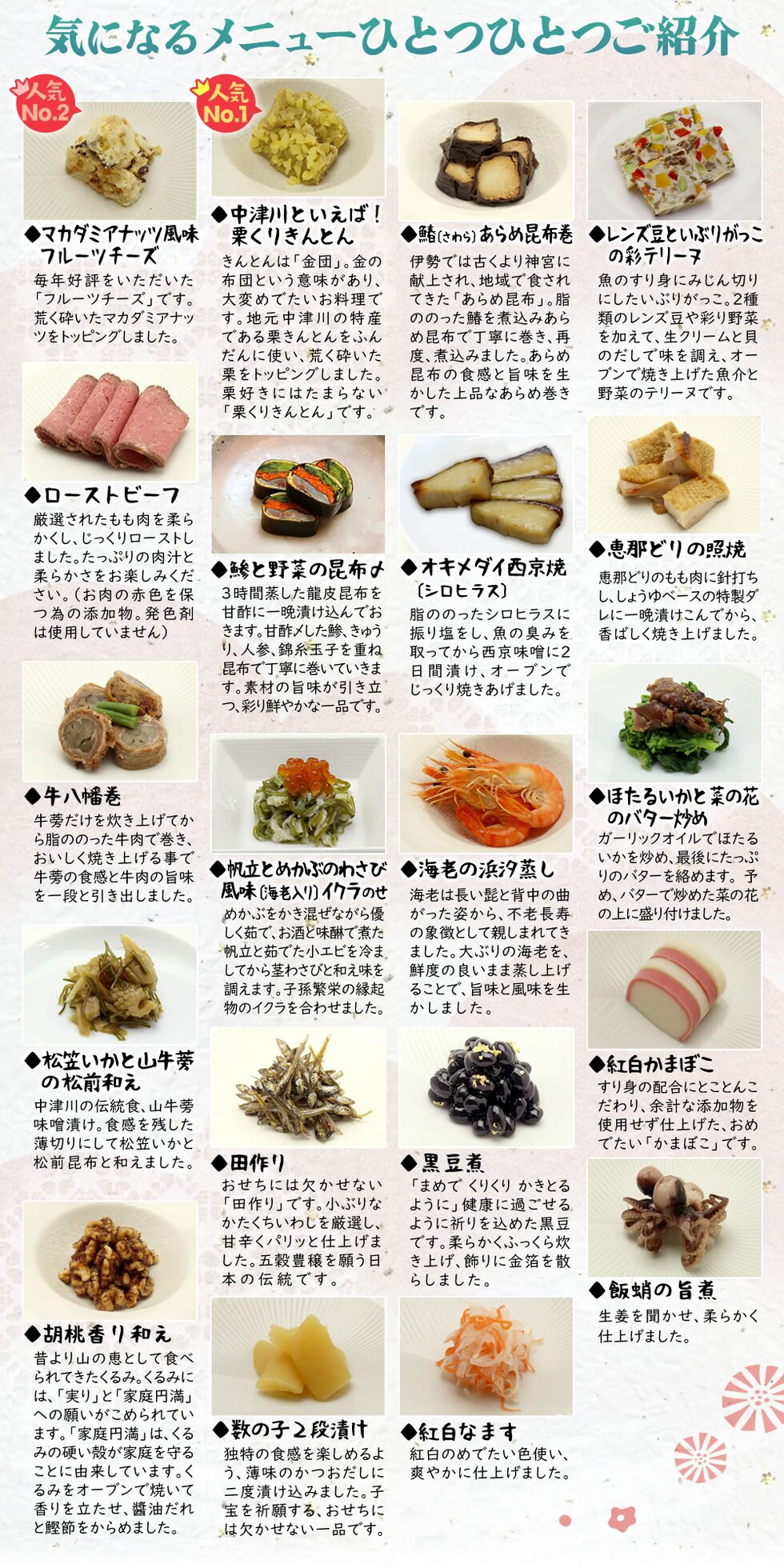 ◇人気メニューNo.1[4倍]◆中津川といえば!栗くりきんとん ◇人気メニューNo.2[4倍]◆マカダミアナッツ風味のフルーツチーズ ◆オキメダイ西京焼〔シロヒラス〕 ◆ほたるいかと菜の花のバター炒め ◆牛八幡巻 ◆レンズ豆といぶりがっこの彩テリーヌ ◆ローストビーフ ◆new》割り干し大根の梅肉桜和え ◆松笠いかと山牛蒡の松前和え ◆帆立とめかぶのわさび風味〔海老入り〕イクラのせ ◆恵那どり照焼 ◆new》ほくほく穴子とたっぷり野菜の新丈 ◆さっぱり杏煮