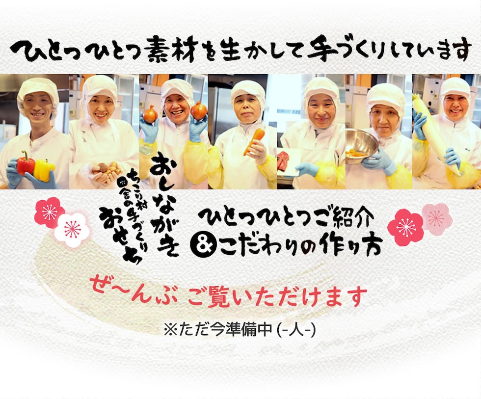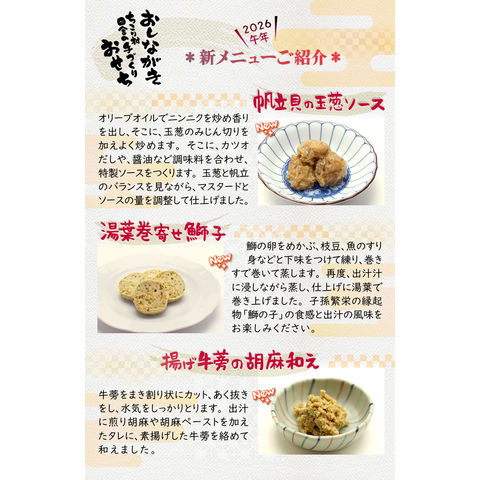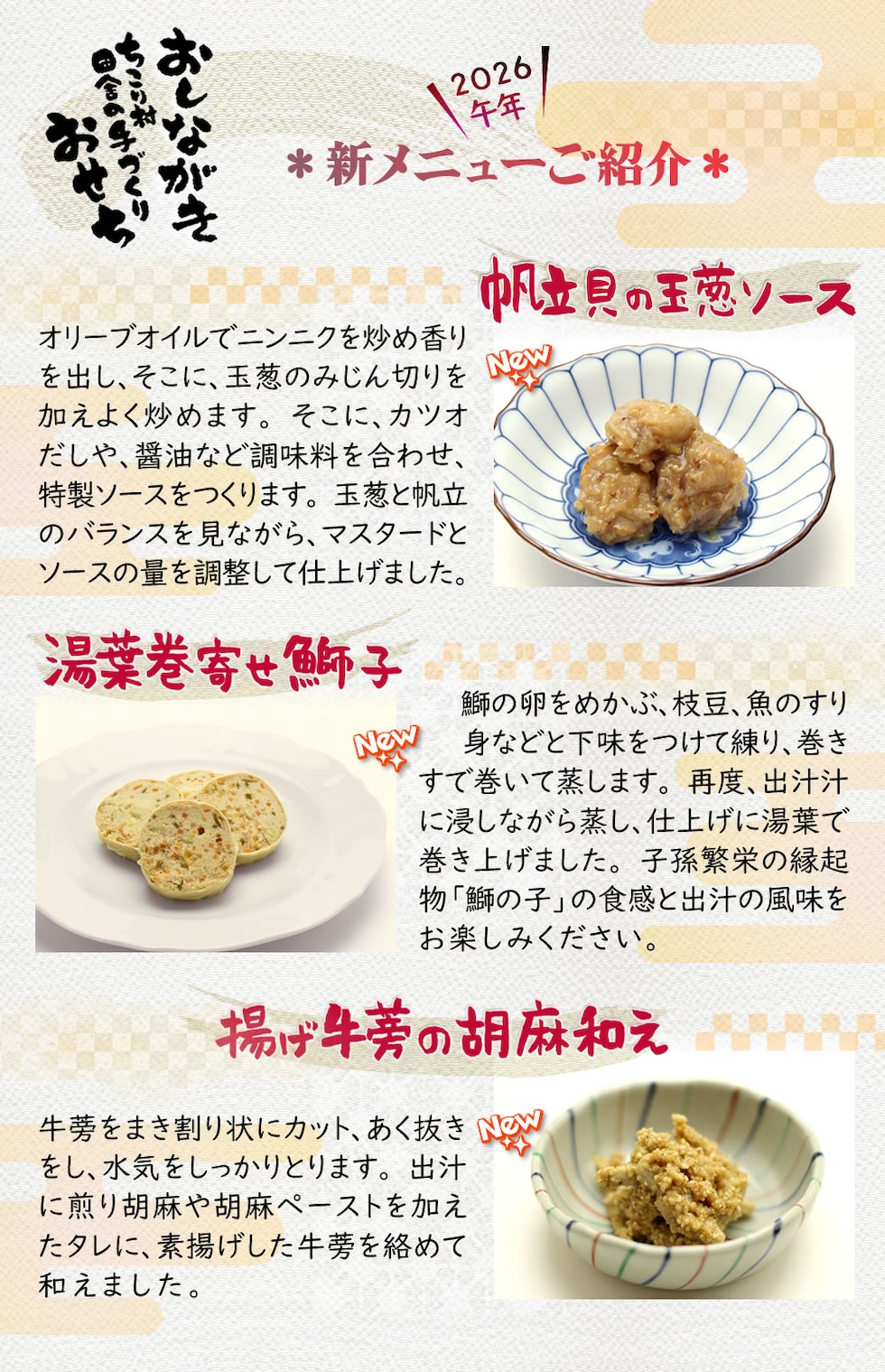 ◆無漂白 有平かまぼこ ◆かれい西京焼(カラスガレイ) ◆浜汐海老 ◆鰊(にしん)昆布巻 ◆刻みゆず入り蓮根団子 ◆かつおくるみ ◆蛸柔煮(たこ やわに) ◆つぶ貝の青のり和え ◆数の子 ◆new》湯葉巻寄せ鰤子 ◆田作り ◆柿なます ◆金箔(きんぱく)黒豆 ◆帆立とめかぶのわさび風味(海老入り)イクラのせ