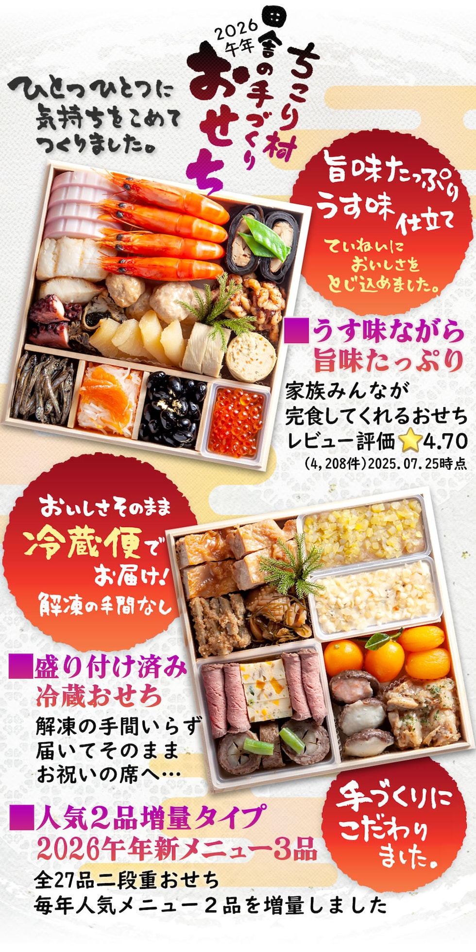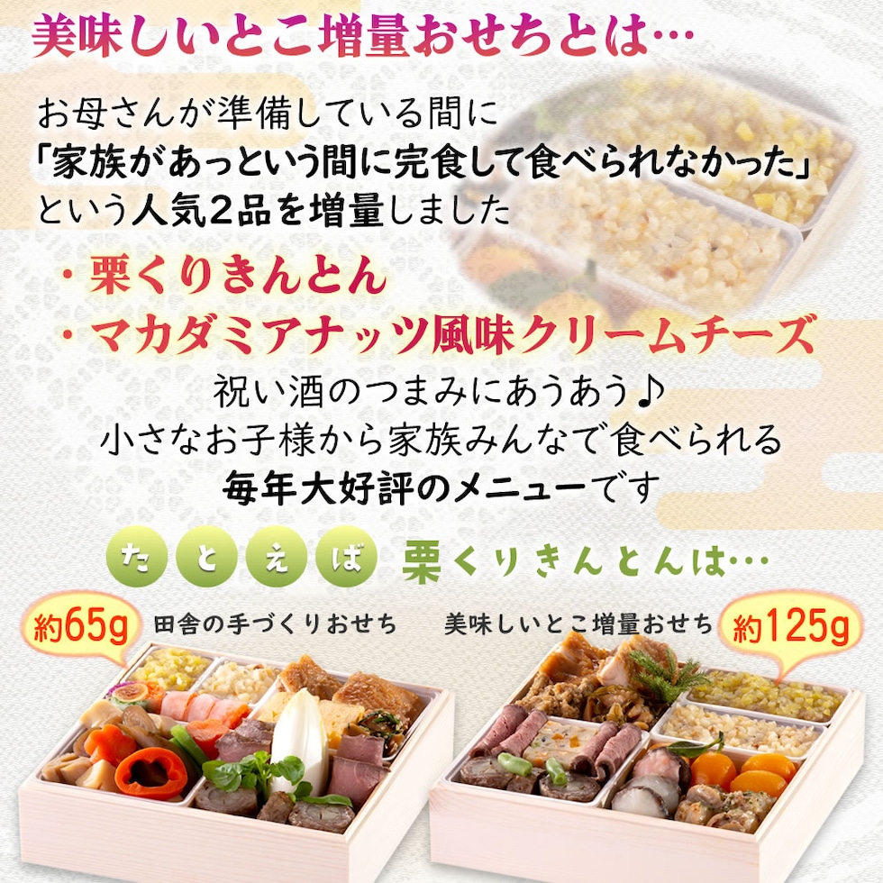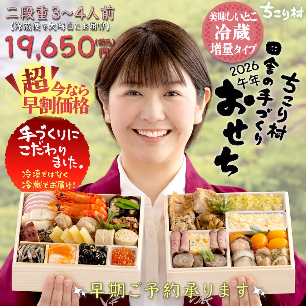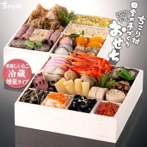 ちこり村 田舎の 手づくり 《美味しいとこ増量》人気メニュー2品増量 おせち 二段重3~4人前 冷蔵 便でお届け♪