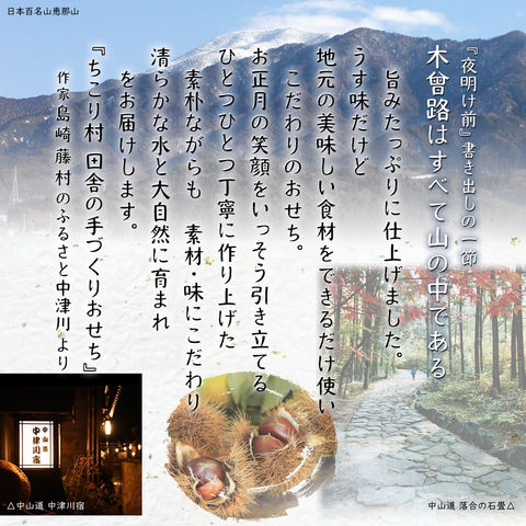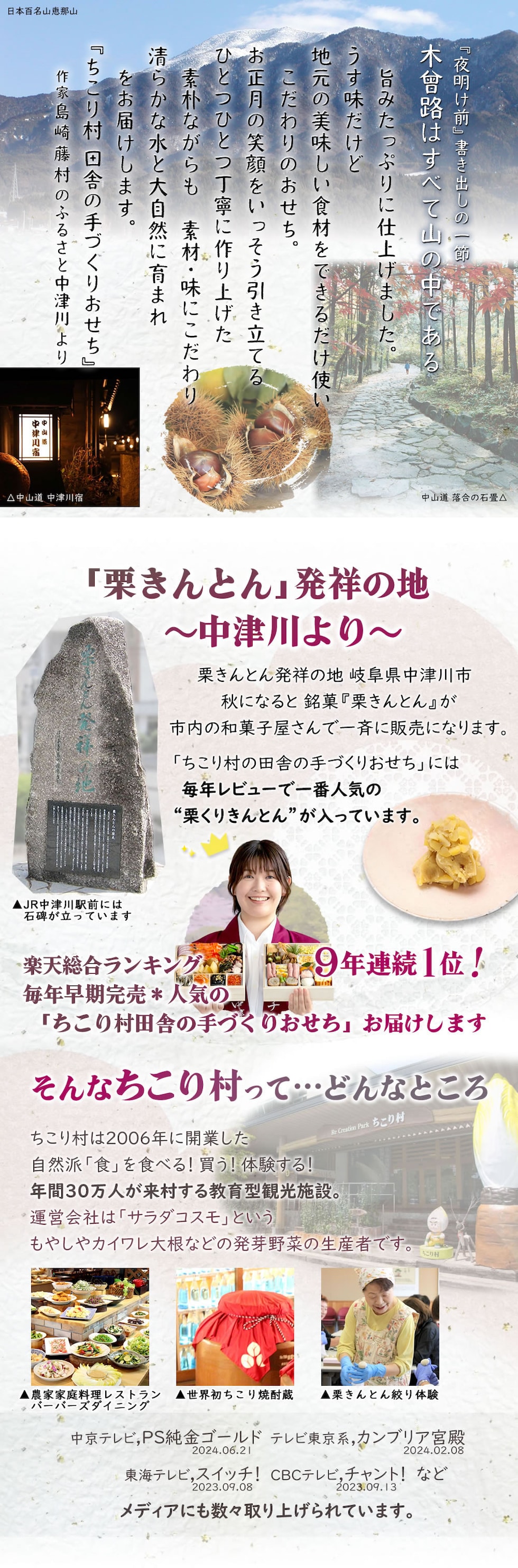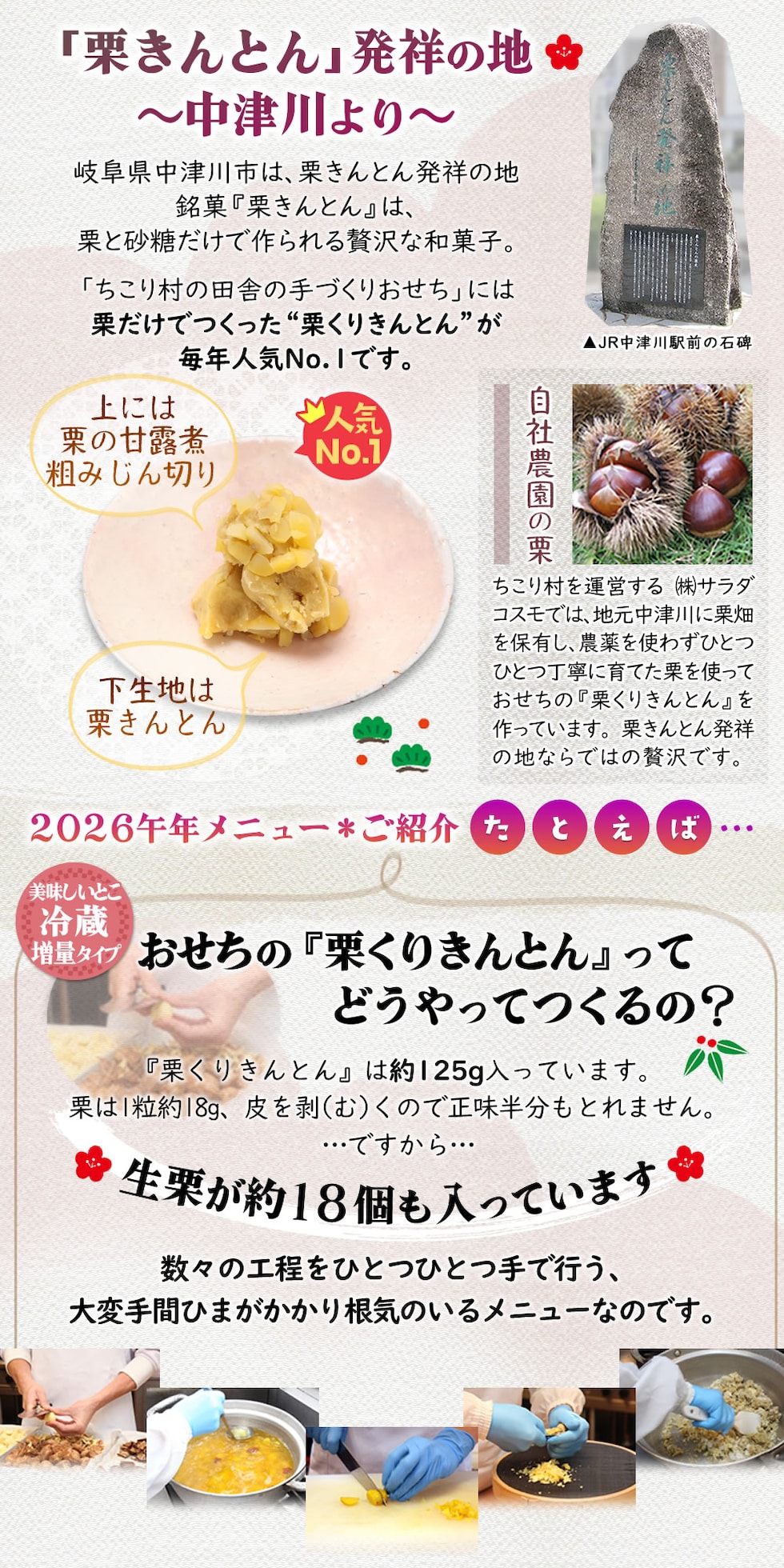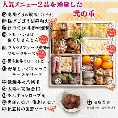 *人気メニューNo.1◆中津川といえば!栗くりきんとん *人気メニューNo.2◆マカダミアナッツ風味 フルーツチーズ ◆恵那どり の鍬焼(くわやき) ◆new》揚げごぼう胡麻和え ◆紋甲いかと山牛蒡の松前和え ◆黒毛和牛 のローストビーフ ◆野菜といぶりがっこチーズのテリーヌ ◆飛騨牛 の八幡巻 ◆太陽の完熟金柑 ◆あんずのシロップ煮 ◆裏白しいたけ海老しいたけ ◆new》帆立貝の玉葱ソース