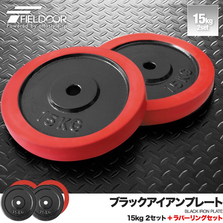 FIELDOOR バーベル 用 プレート 15kg 2個セット ブラックアイアン + ラバーリング 付き 追加プレート 追加 ダンベルプレート バーベルシャフト 用 ダンベル ラバーダンベル 筋トレ トレーニング 交換 パーツ オプション 計30kg 送料無料