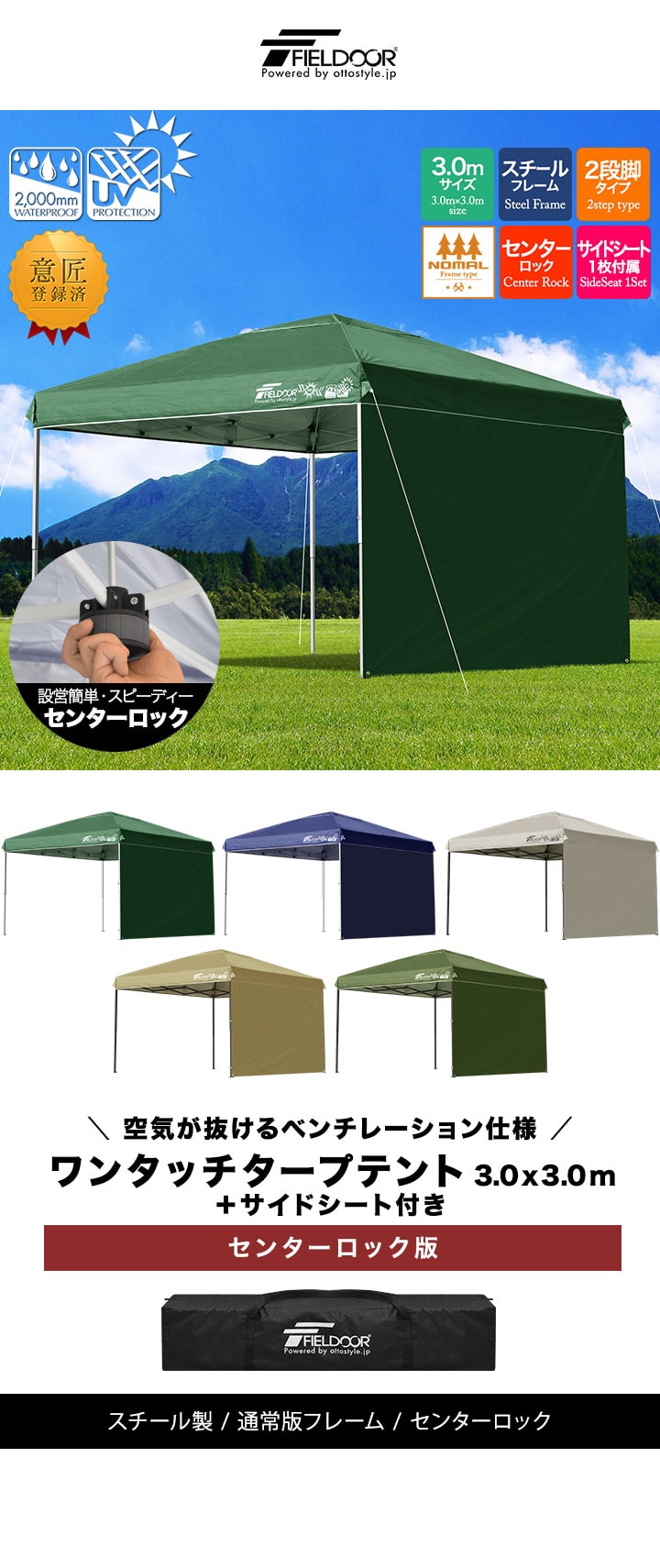 FIELDOOR ワンタッチタープテント 3m (標準:ライトベージュ/スチール/センターロック/ウエイト4点組み/サイドシート1枚付) テント タープ ワンタッチ ワンタッチテント ワンタッチタープ UV加工 撥水 ベンチレーション 収納バッグ付 日よけ キャンプ 送料無料