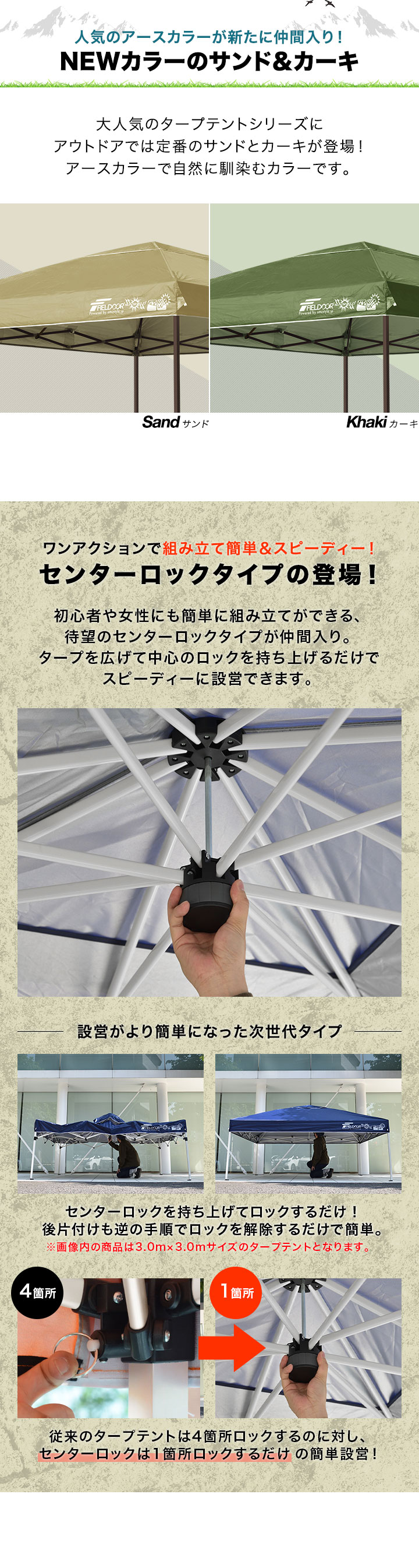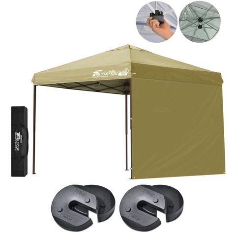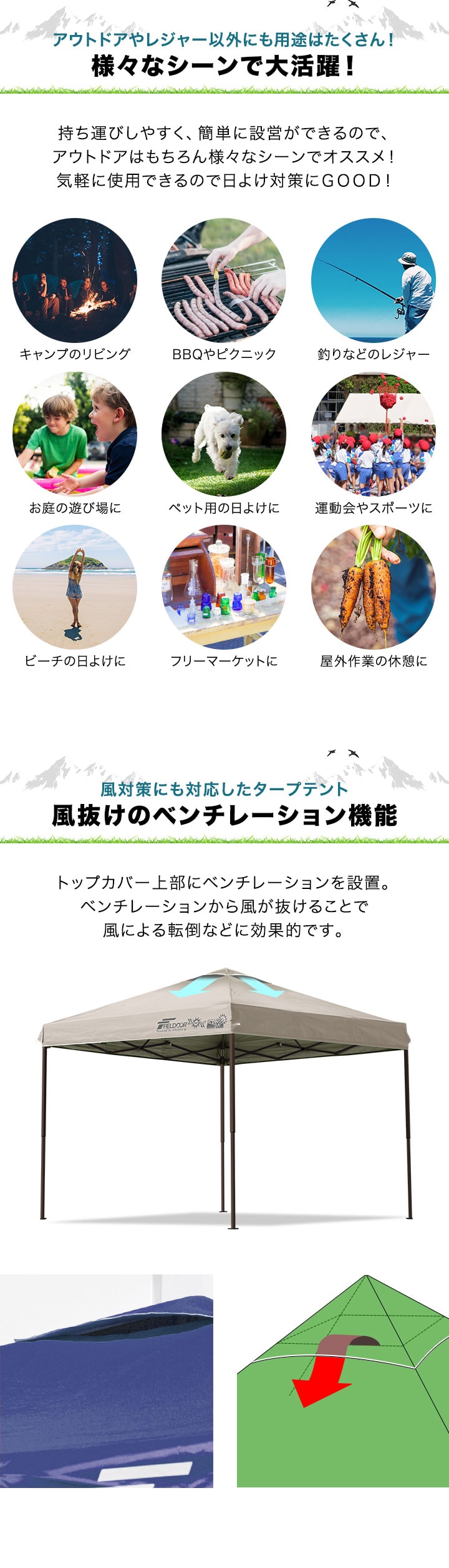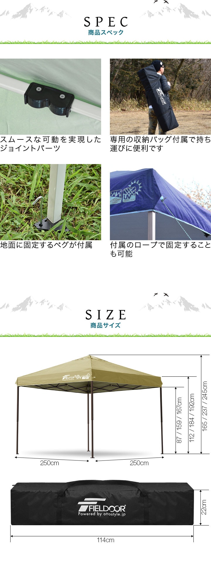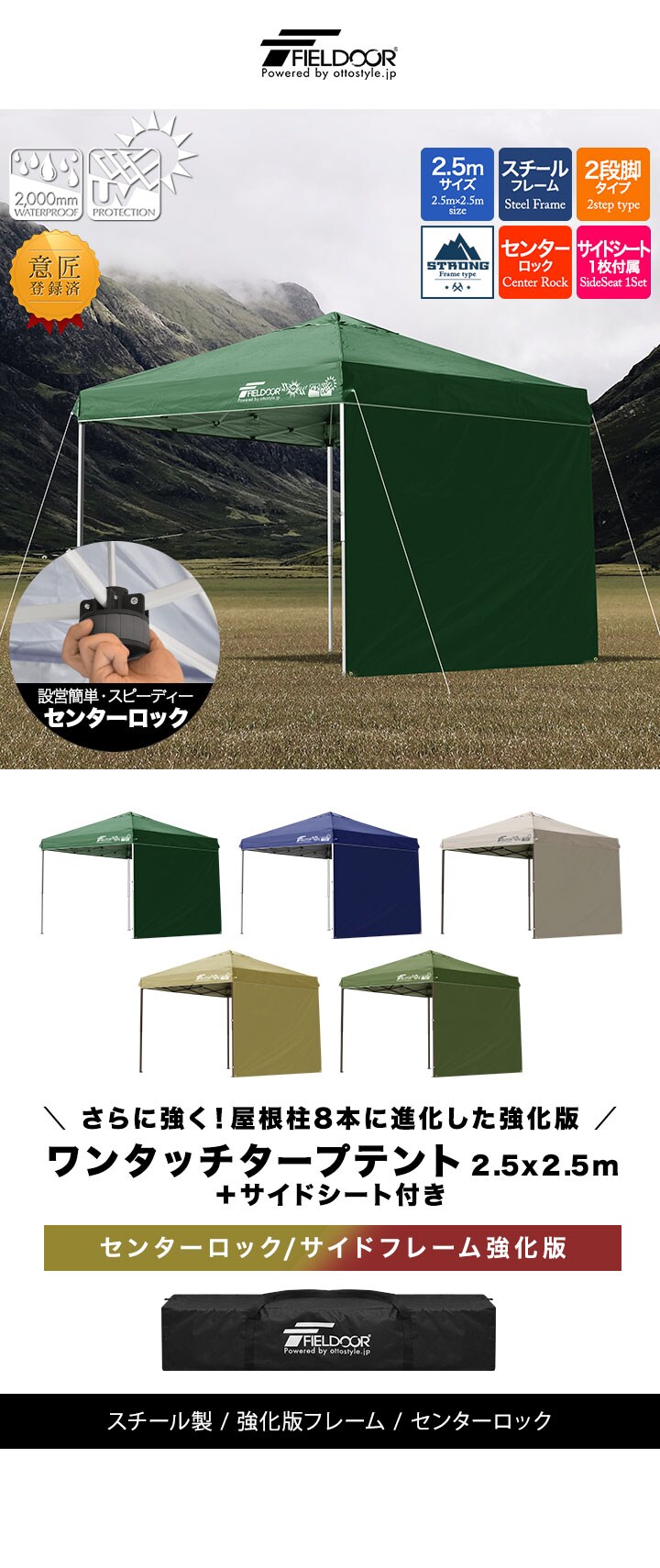 FIELDOOR ワンタッチタープテント 2.5m (標準:サンド/スチール/強化版サイドフレーム/センターロック/ウエイト4点組み/サイドシート1枚付) テント タープ ワンタッチテント ワンタッチタープ UV加工 撥水 ベンチレーション 日よけ キャンプ 送料無料