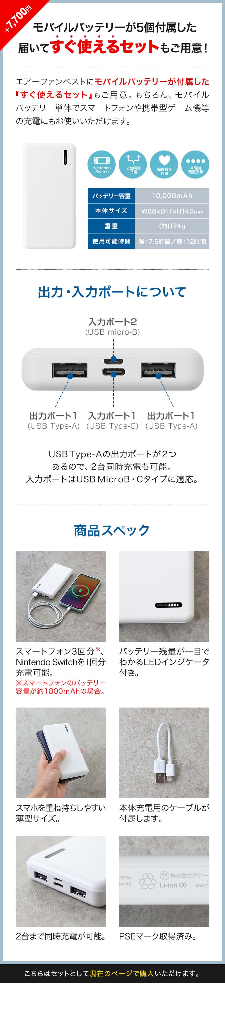 | 連続稼働時間: ・強:(約)7.5時間 ・中:(約)11時間 ・弱:(約)12時間 ※容量10,000mAhのバッテリーを使用した場合の目安時間です。 |