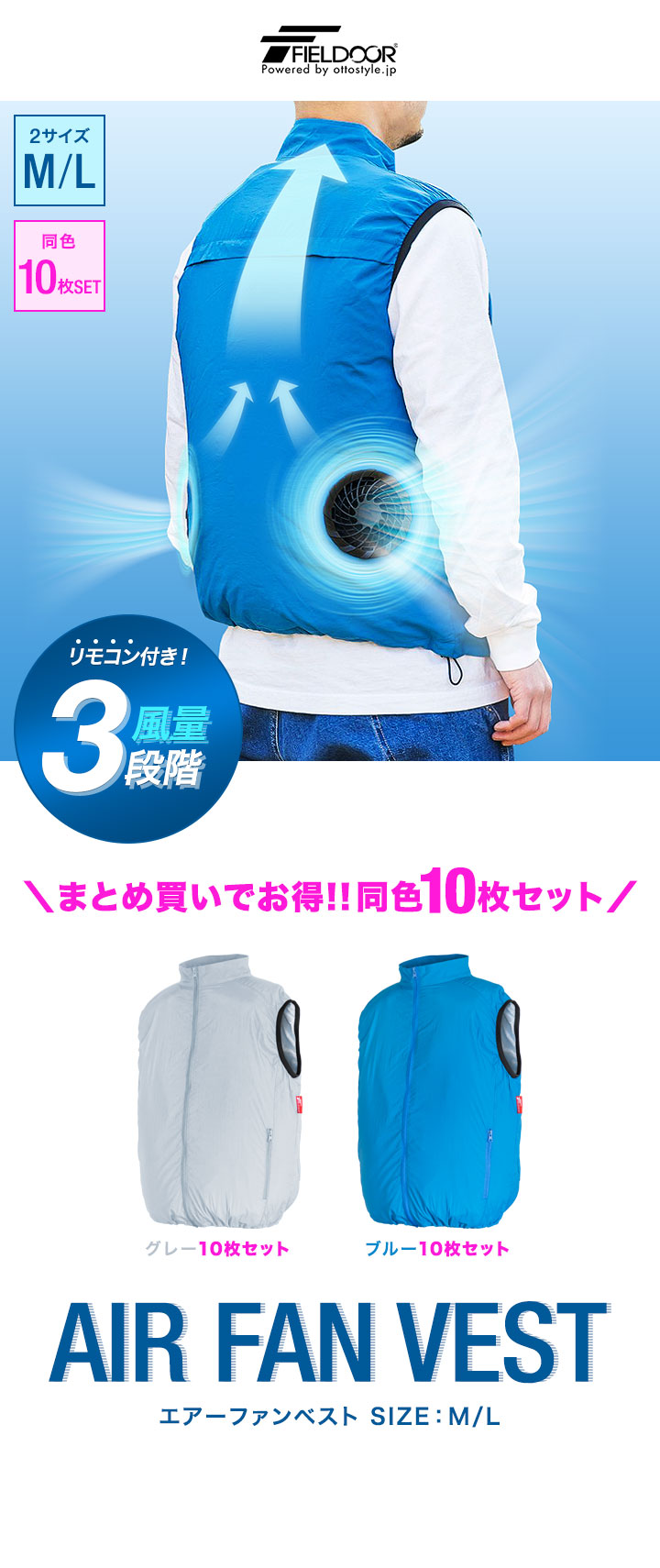 空調ウェア ファン付きベスト (10着セット/Mサイズ/グレー/ウエア&ファンのみ/モバイルバッテリー付セット) 男女兼用 空調ウェア 空調ファン付き 電動ファン付き USB電源供給 モバイルバッテリー対応 熱中症対策 涼感 空調作業服 作業着 FIELDOOR エアーファンベスト 送料無料