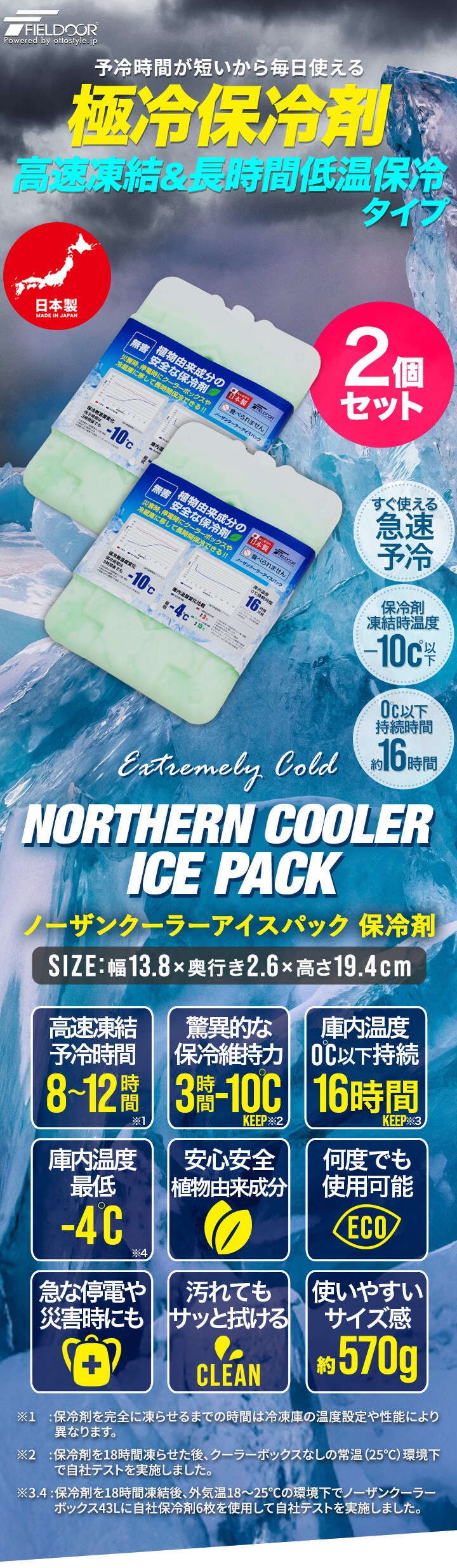 FIELDOOR 保冷剤 最強 長時間 氷点下 ノーザンクーラー アイスパック 2個セット 13.8×19.4cm 570g 保冷パック 安心 日本製 急速予冷 繰り返し NORTHERN COOLER ICE PACK クーラーボックス 保冷バッグ アウトドア キャンプ 釣り 送料無料