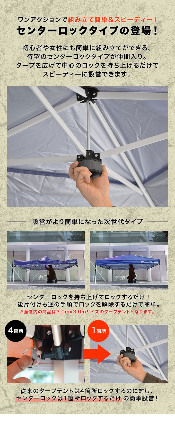 | サイズ: 組立時 : (約)2.5m×2.5m×1.65m / 2.37m / 2.45m 収納時 : (約)22cm×22cm×114cm |