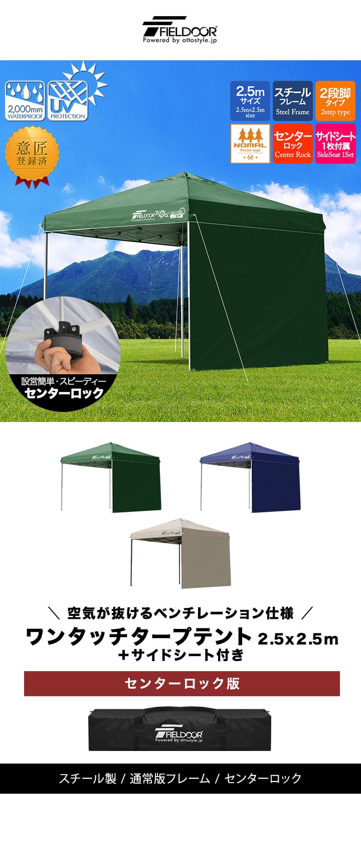 FIELDOOR ワンタッチタープテント 2.5m (標準:グリーン/スチール/センターロック/強化サポート/サイドシート1枚付) テント タープ ワンタッチ ワンタッチテント ワンタッチタープ UV加工 撥水 ベンチレーション 収納バッグ付 日よけ キャンプ バーベキュー 送料無料