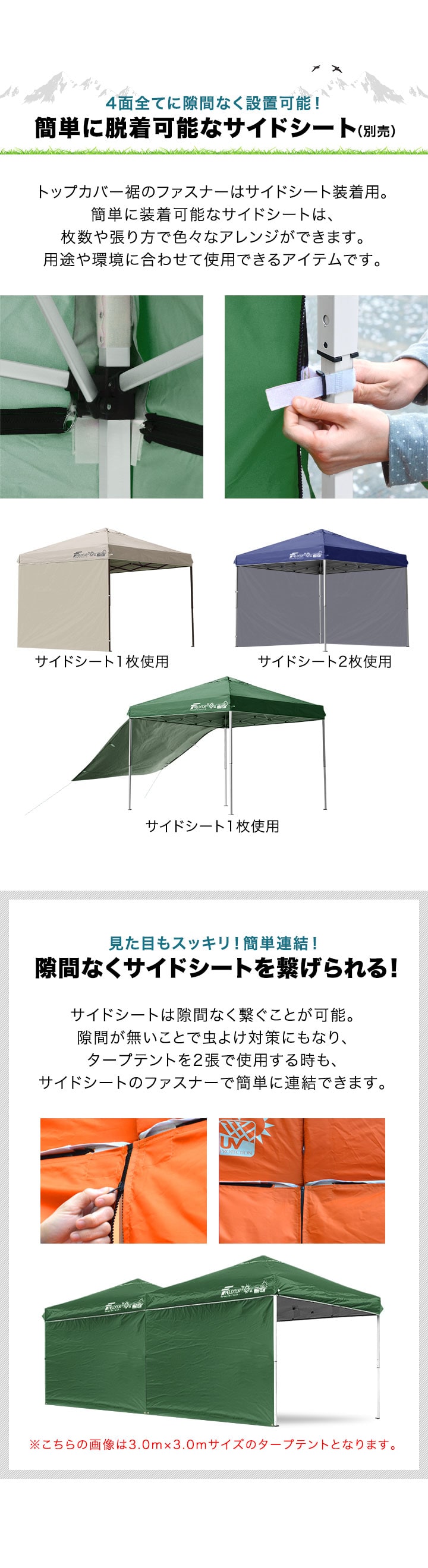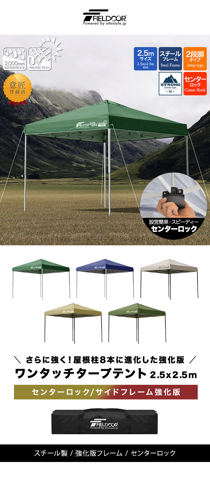 FIELDOOR ワンタッチタープテント 2.5m (標準:グリーン/スチール/強化版サイドフレーム/センターロック/グランドシート) テント タープ ワンタッチ ワンタッチテント ワンタッチタープ UV加工 撥水 ベンチレーション 収納バッグ付 日よけ キャンプ 送料無料