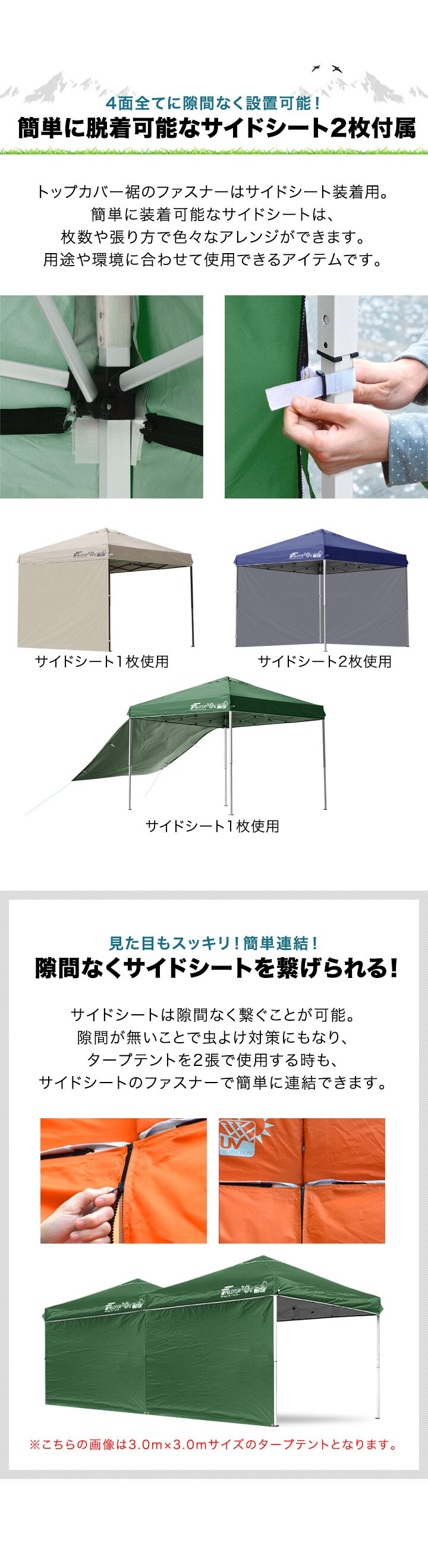 | 付属品: ・専用サイドシート(2枚) ・ロープ ・ペグ ・収納バッグ ・取扱説明書 |
