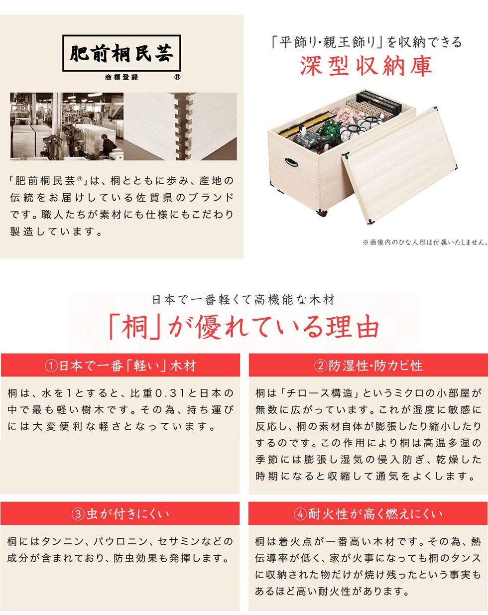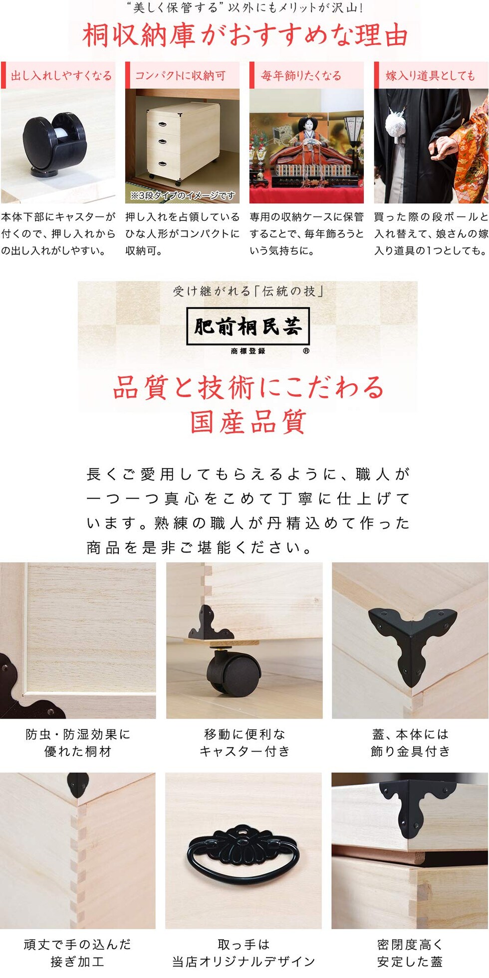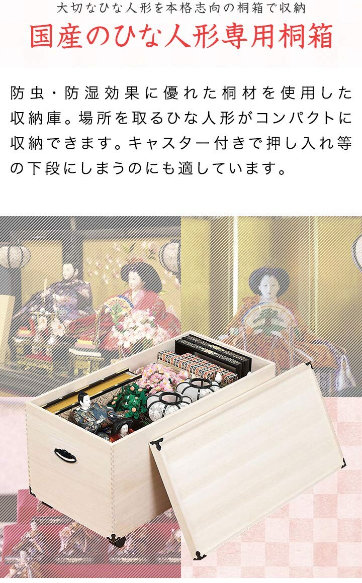 防虫・防湿効果に優れた桐材を使用した収納庫。場所を取るひな人形がコンパクトに収納できます。キャスター付きで押し入れ等の下段にしまうのにも適しています。