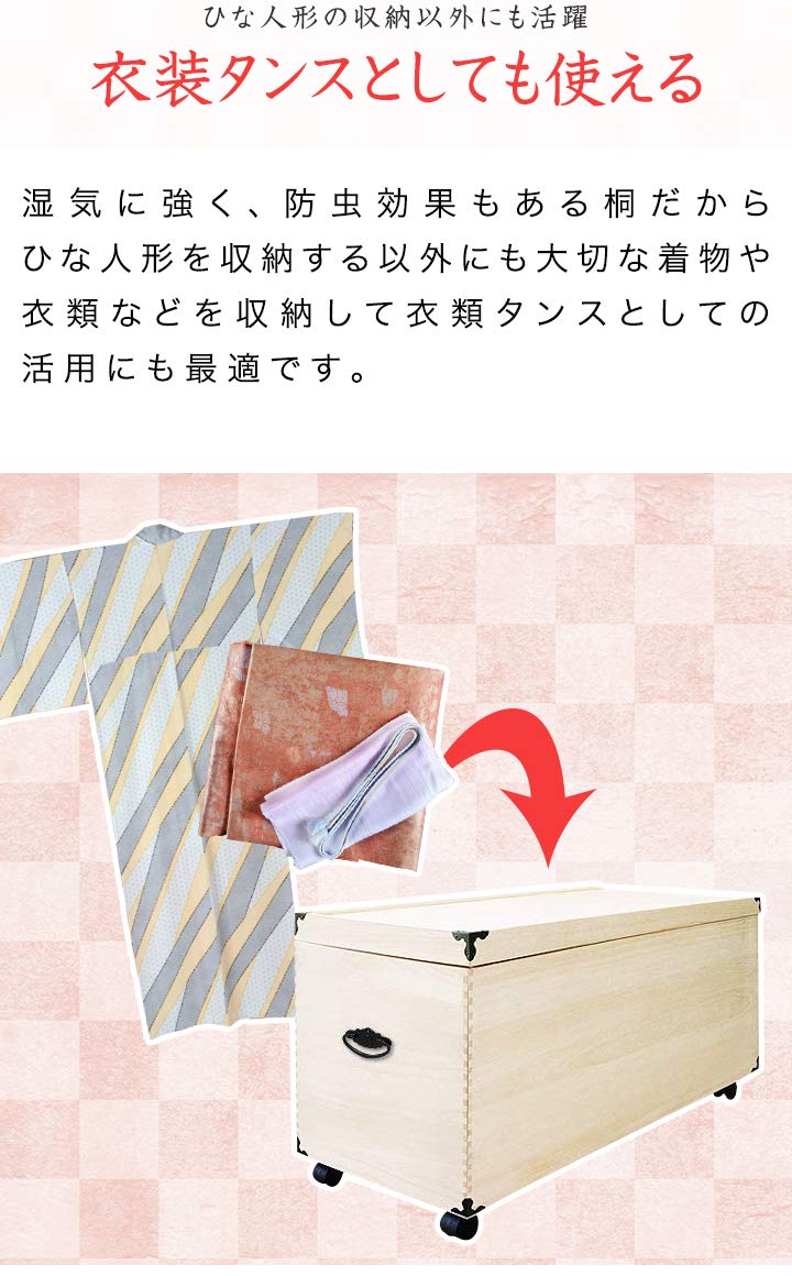 湿気に強く、防虫効果もある桐だからひな人形を収納する以外にも大切な着物や衣類などを収納して衣類タンスとしての活用にも最適です。