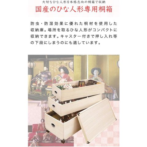 防虫・防湿効果に優れた桐材を使用した収納庫。場所を取るひな人形がコンパクトに収納できます。キャスター付きで押し入れ等の下段にしまうのにも適しています。