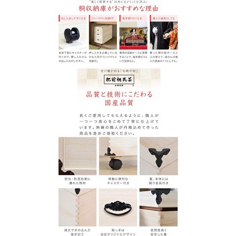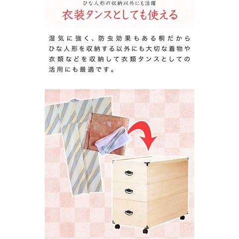 湿気に強く、防虫効果もある桐だからひな人形を収納する以外にも大切な着物や衣類などを収納して衣類タンスとしての活用にも最適です。