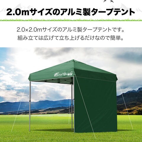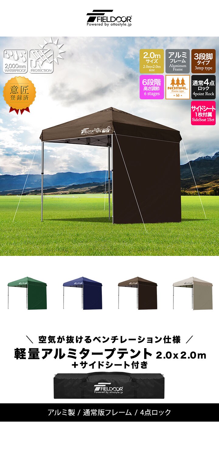 FIELDOOR ワンタッチタープテント 2m (標準:ブルー/アルミ/4点脚ロック/強化サポート/サイドシート1枚付) 軽量 テント タープ ワンタッチ ワンタッチテント ワンタッチタープ UV加工 撥水 ベンチレーション 収納バッグ付 日よけ キャンプ バーベキュー 送料無料