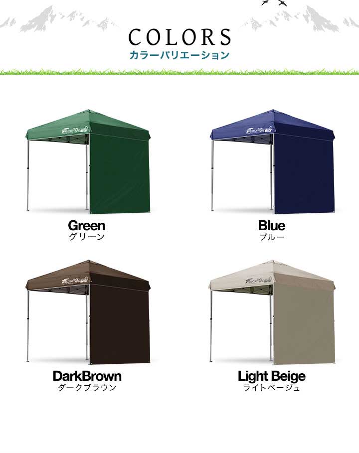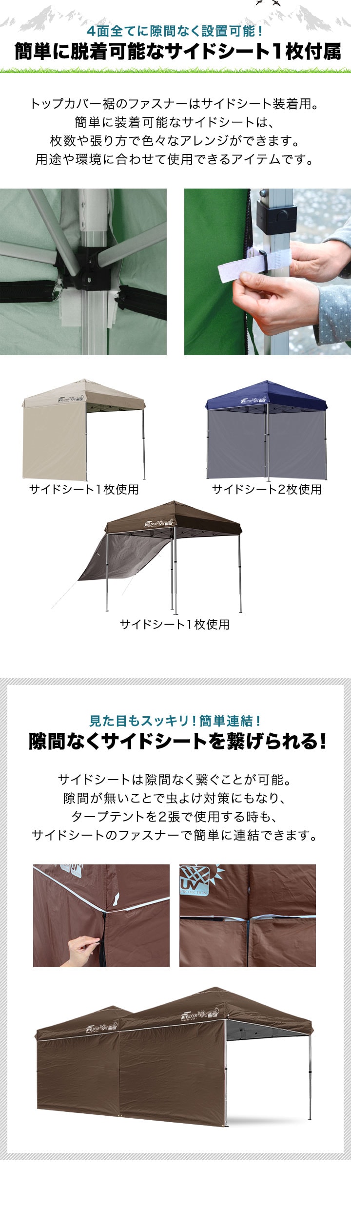 | 付属品: ・専用サイドシート(1枚) ・ロープ ・ペグ ・収納バッグ ・取扱説明書 |