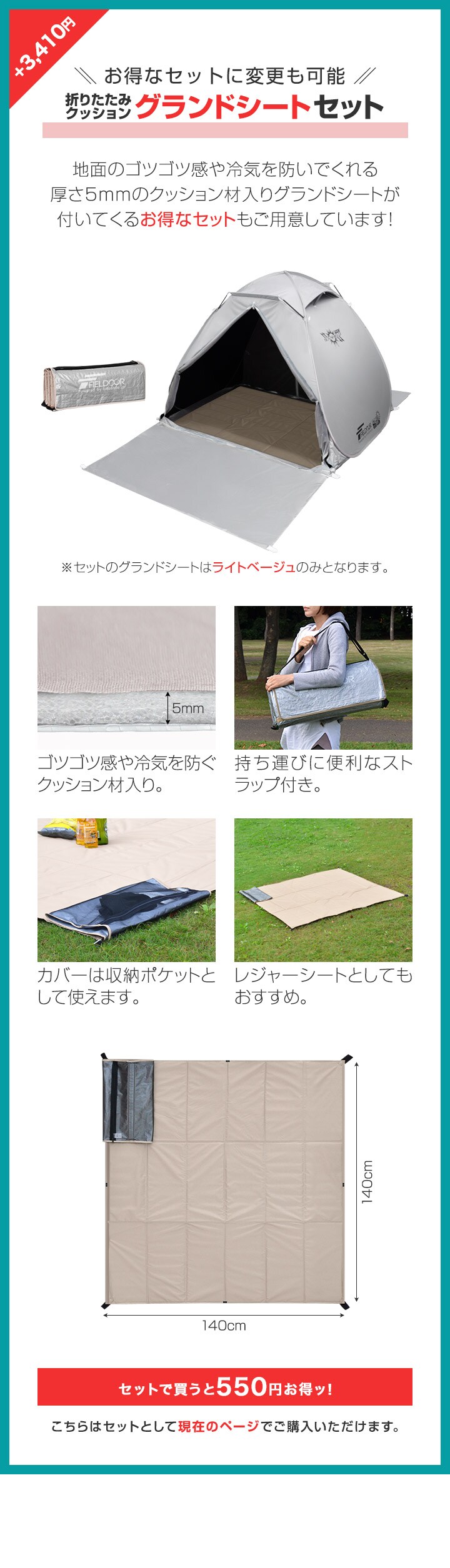 FIELDOOR テント ワンタッチ (ライトベージュ/グランドシート付セット ) 160cm 1人用 2人用 3人用 小型 遮光 遮熱 UVカット 耐水 公園 ワンタッチテント ポップアップテント 日よけ サンシェード メッシュ ドームテント 簡易テント 外遊び ピクニック フルクローズ 送料無料