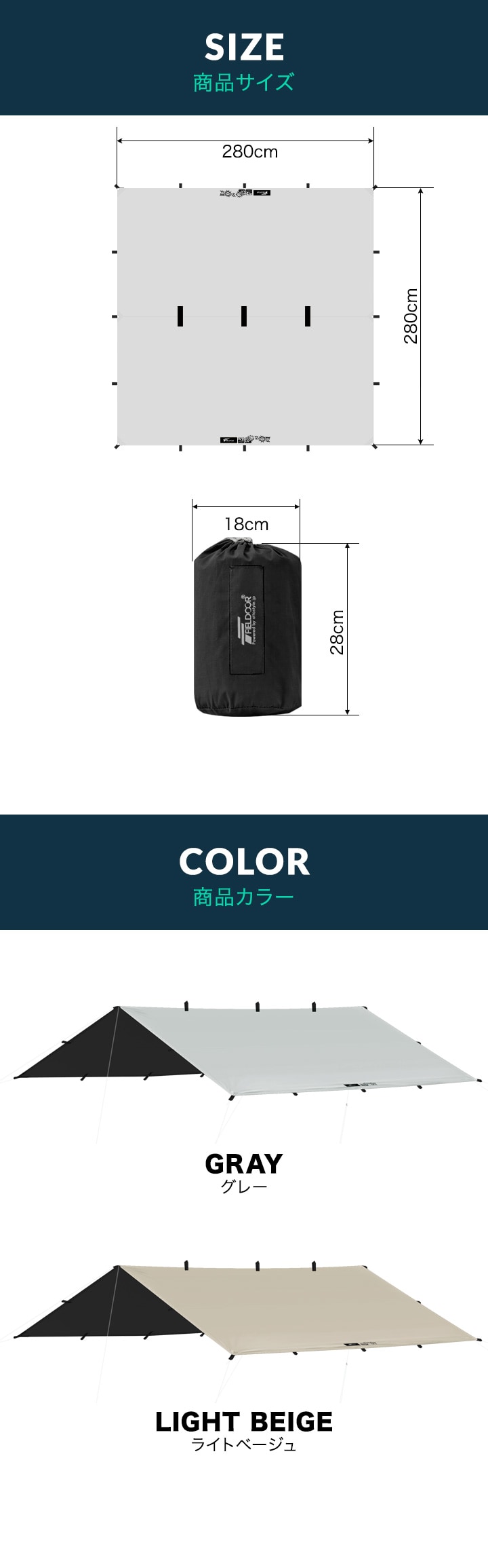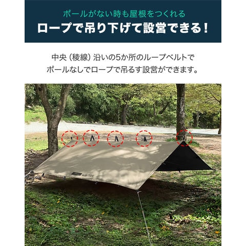 FIELDOOR スクエアタープ 2~4人用 (グレー:遮光高耐水/本体&5連結150cmポール2本セット) 2.8m×2.8m 遮熱 遮光 タープテント 日よけ UVカット 高耐水 ソロキャンプ テントポール サンシェード ヘキサタープ 正方形 アウトドア BBQ キャンプ 送料無料