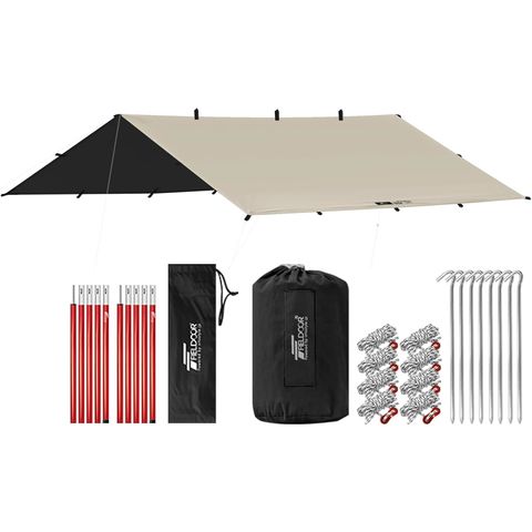 FIELDOOR スクエアタープ 2~4人用 (ライトベージュ:遮光高耐水/本体&5連結150cmポール2本セット) 2.8m×2.8m 遮熱 遮光 タープテント 日よけ UVカット 高耐水 ソロキャンプ テントポール サンシェード ヘキサタープ アウトドア BBQ キャンプ 送料無料
