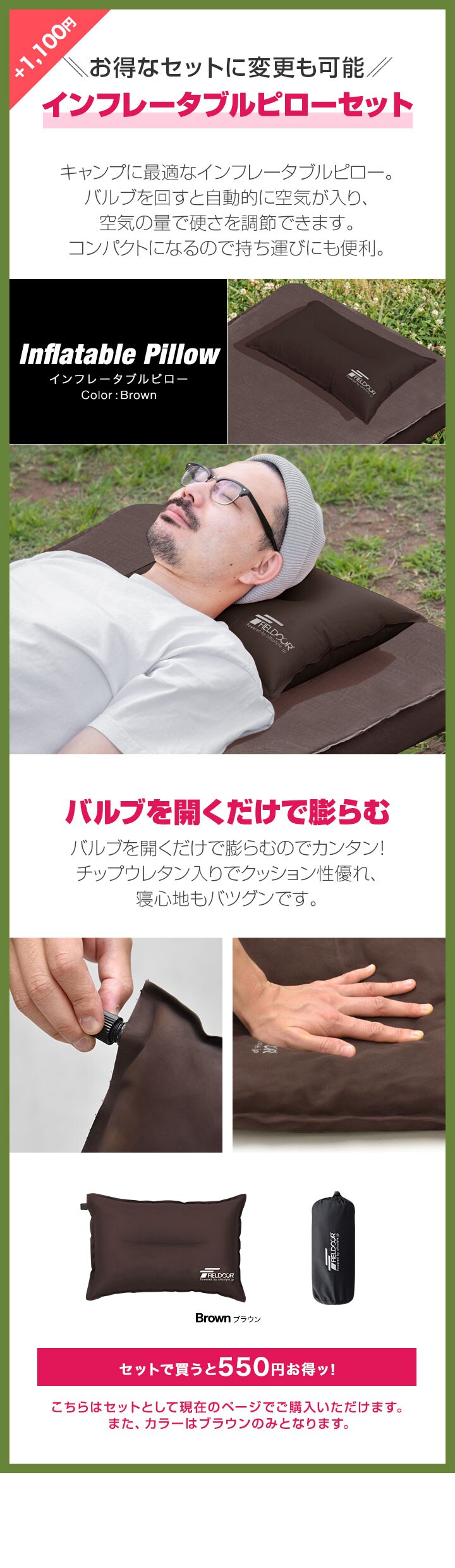 FIELDOOR キャンプマット 厚さ10cm (シングル:幅75cm×200cm/マット1枚&枕x1点つき) インフレーターブルマット ポンプ付きエアーマット 高密度ウレタン アウトドア寝具 アウトドア テントマット 車中泊マット エアーベッド エアーポンプ付属キャンプマット 送料無料