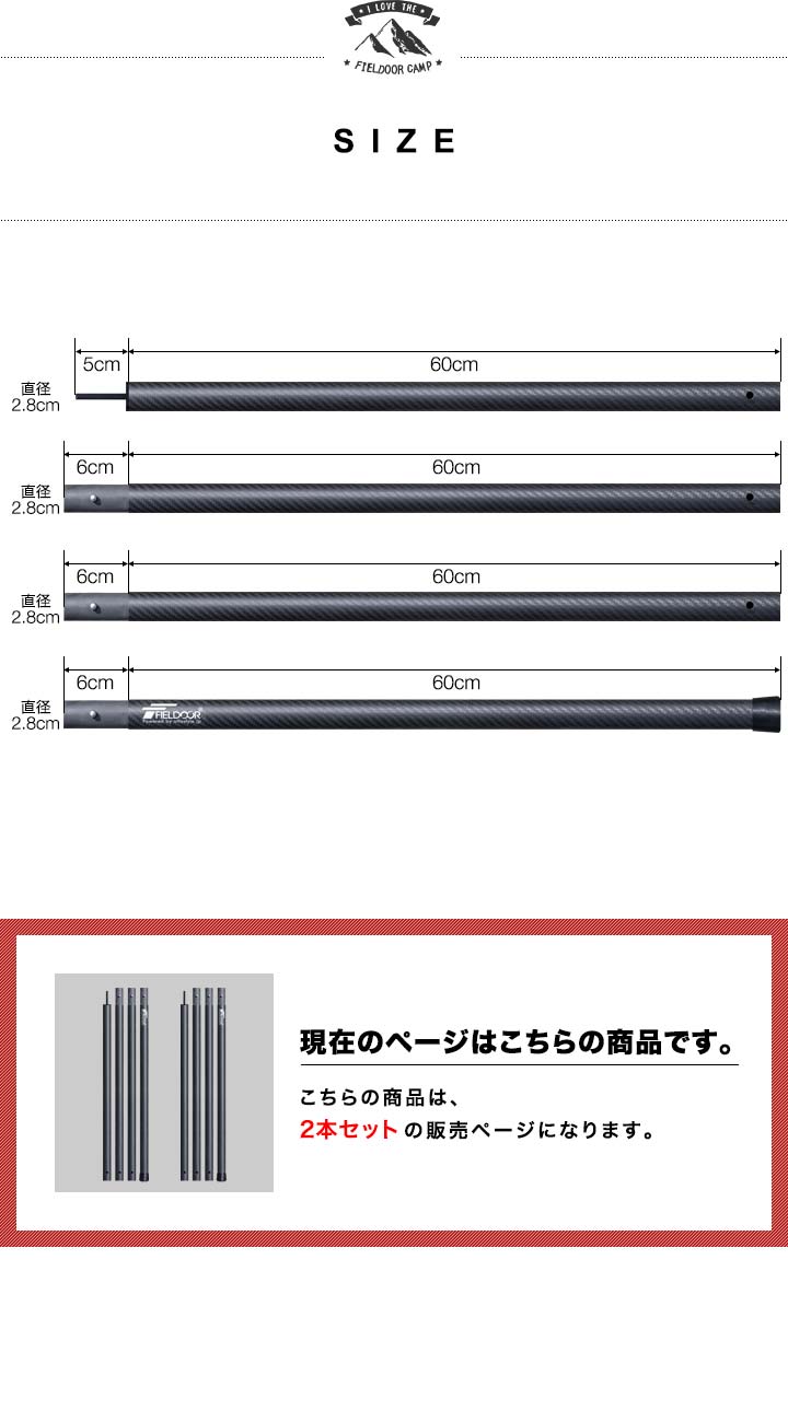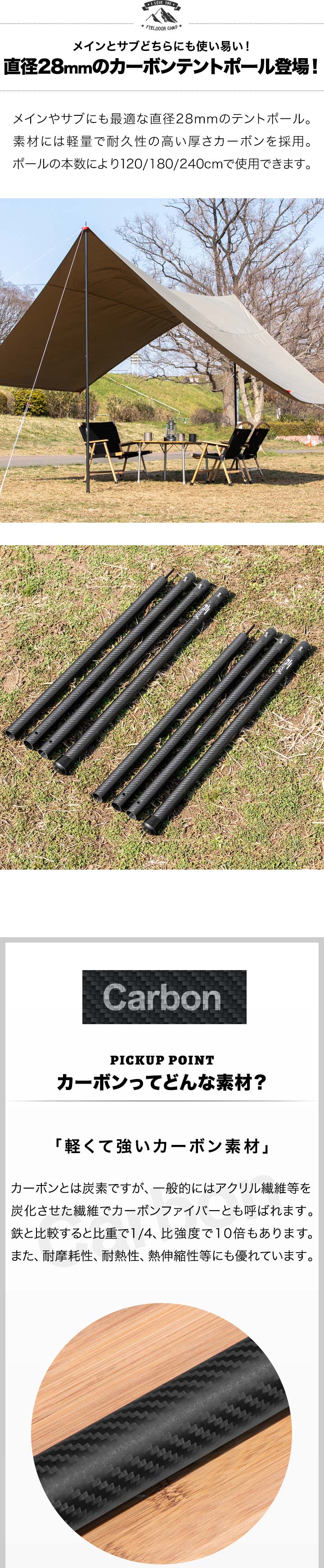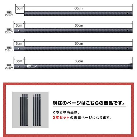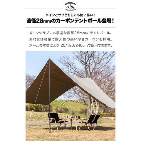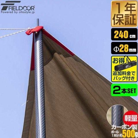 FIELDOOR テントポール 軽量 カーボン製テントポール (ポール2本セットのみ) 直径28mm 4本連結 高さ120cm、180cm、240cm 簡単 ポール コンパクト タープポール メイン サブ 追加 テント キャンプ タープテント カーボンテントポール 送料無料