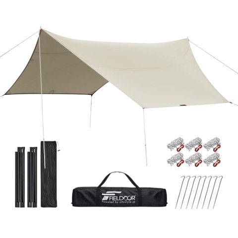 FIELDOOR タープテント ヘキサタープ (ライトベージュ:標準/本体&スチールポール2組セット) 大型 Mサイズ 4.4m×4.7m 4~6人用 日よけ 六角形 UVカット 高耐水 簡易テント サンシェード オーニング コンパクト アウトドア BBQ キャンプ 送料無料