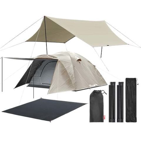 FIELDOOR キャンプ お買い得 (ライトベージュ/ファミリーテント+タープ+シート+ポール) 4点セット 4人~6人用 大型 フィールドキャンプドーム300 キャンプテント ドームテント キャノピーテント フルクローズテント テント 組み立て簡単 入門 初心者 エントリー アウトドア 送料無料
