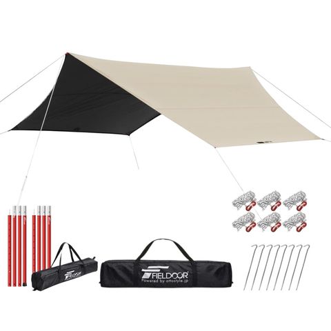FIELDOOR タープテント ヘキサタープ (ライトベージュ:遮光高耐水タイプ/アルミポール付き) 大型 Lサイズ 幅530cm×570cm 6~8人用 タープテント 日よけ UVカット 高耐水 テントポール サンシェード オーニング スクリーン 六角形 アウトドア BBQ キャンプ 送料無料