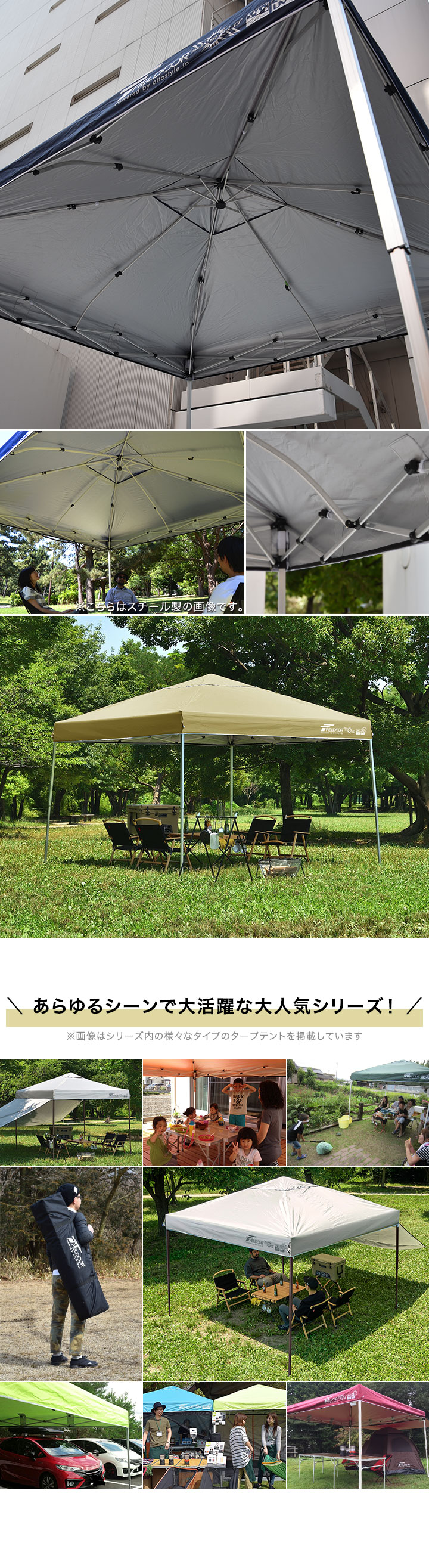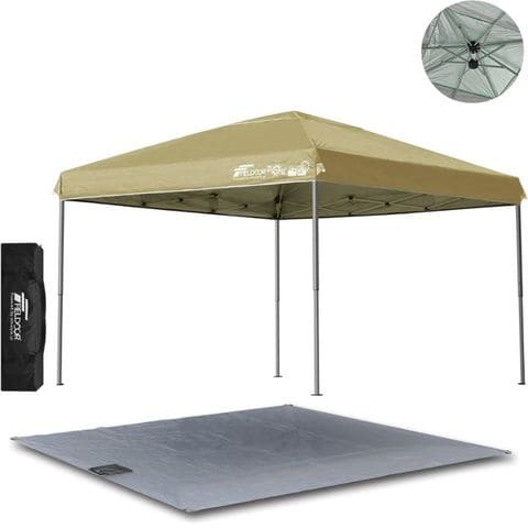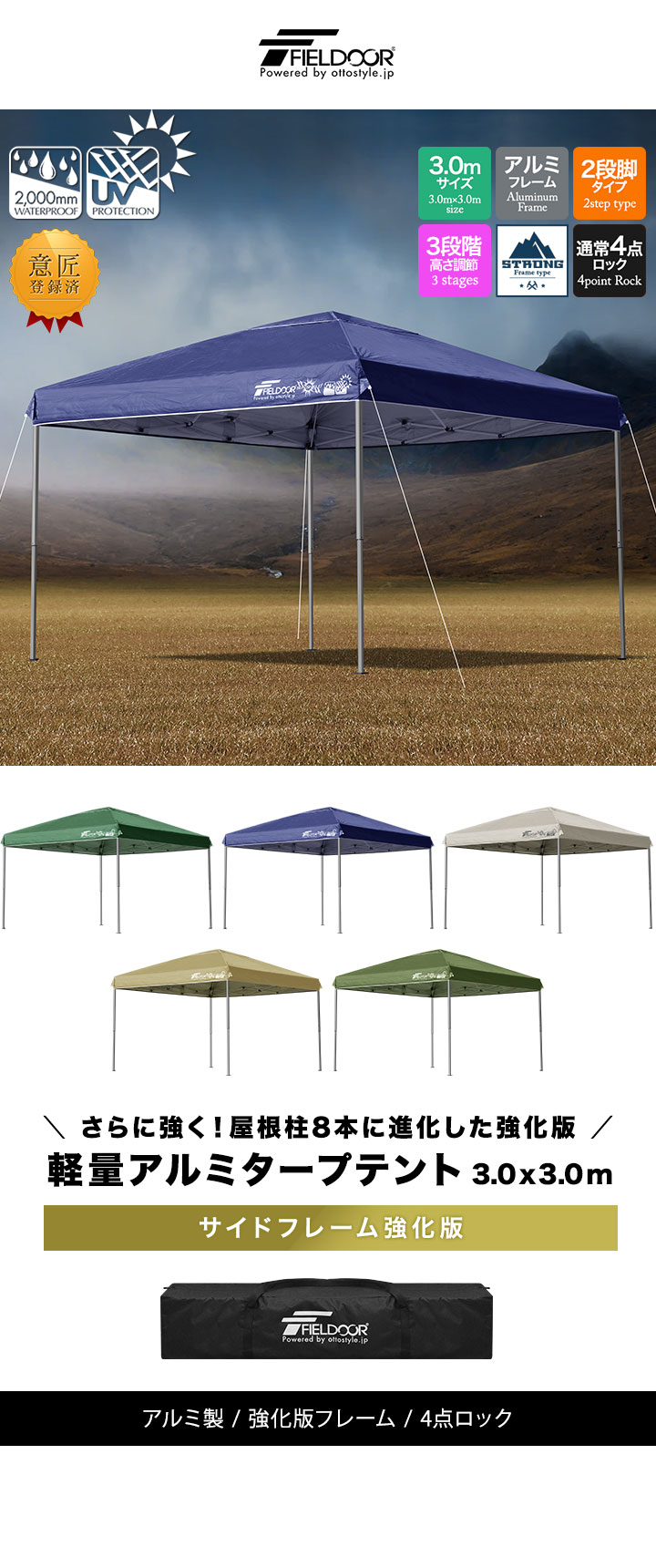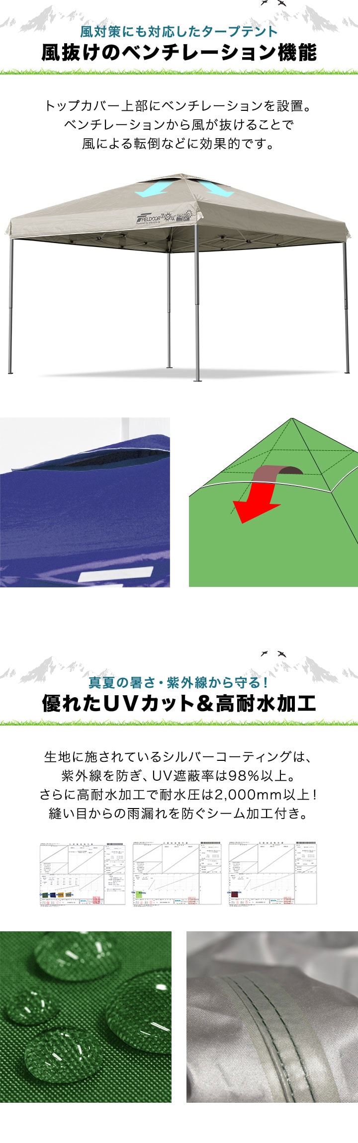 FIELDOOR ワンタッチタープテント 3m (標準:サンド/アルミ/強化版サイドフレーム/4点脚ロック/グランドシート) 軽量 テント タープ ワンタッチ ワンタッチテント ワンタッチタープ UV加工 撥水 ベンチレーション 収納バッグ付 日よけ キャンプ 送料無料