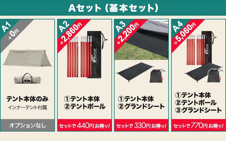 | セット内容: ・テント本体×1 ・インナーテント×1 ・ポール×3 ・ペグ×14 ・ロープ×4 ・収納バッグ×1 ・取扱説明書(日本語) |