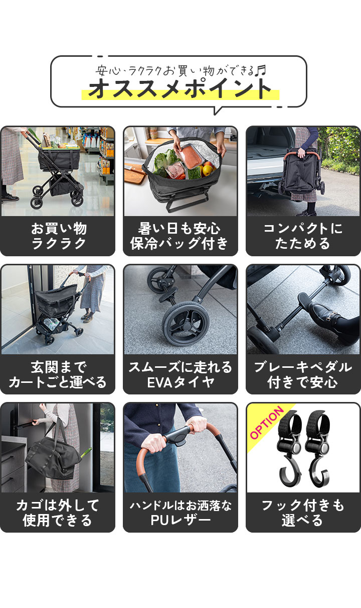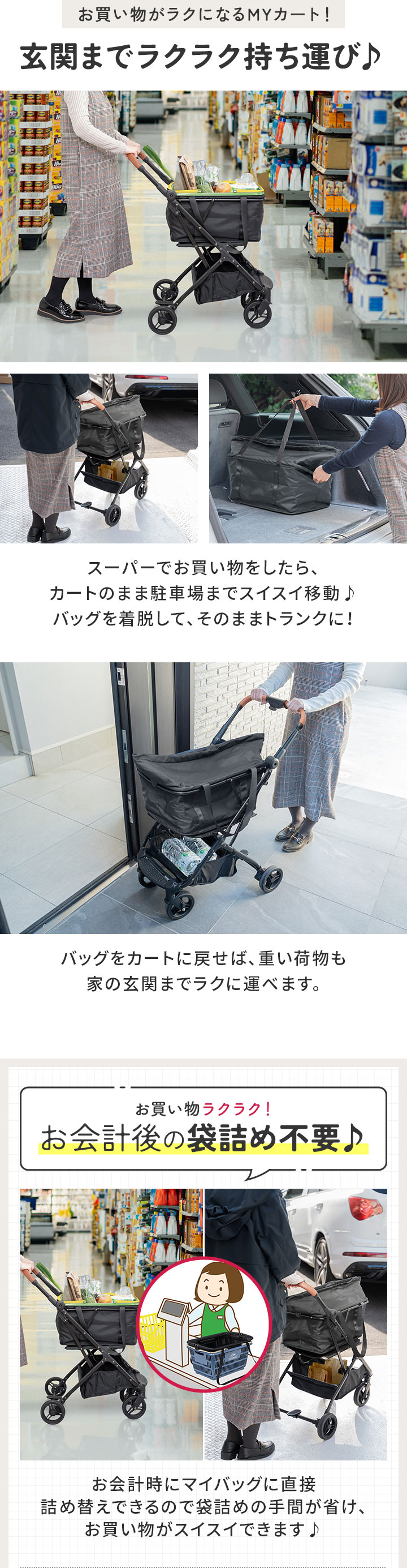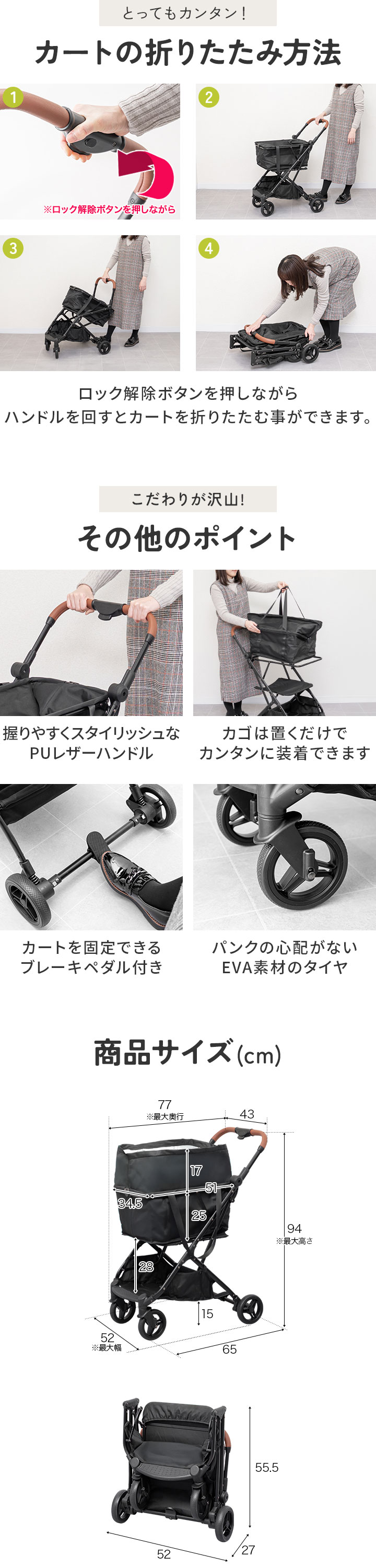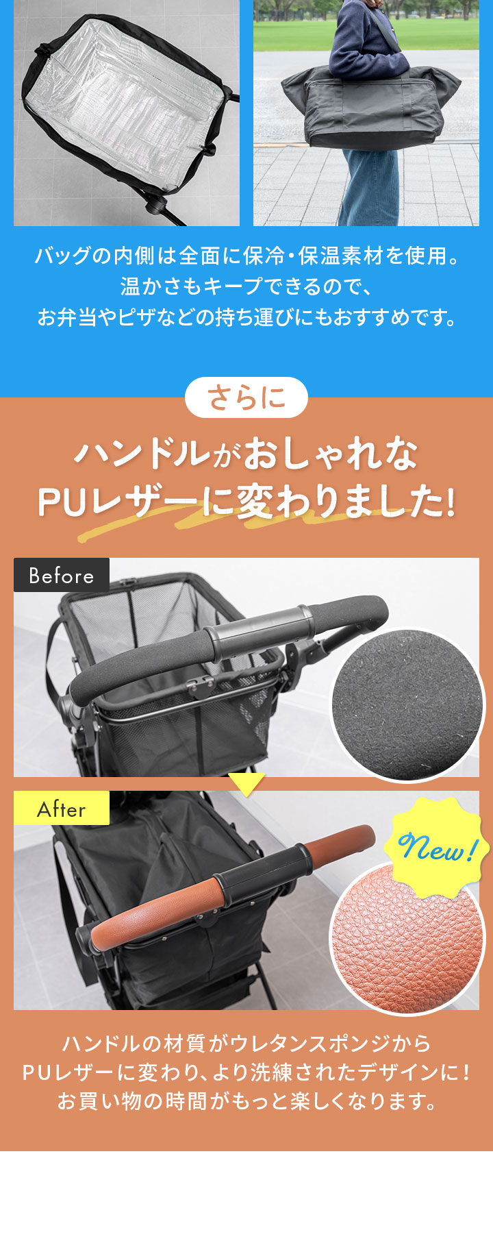材質: 本体 : アルミ、PU カゴ:スチール、ポリエステル(内布:アルミニウム加工)、PP タイヤ:EVA |