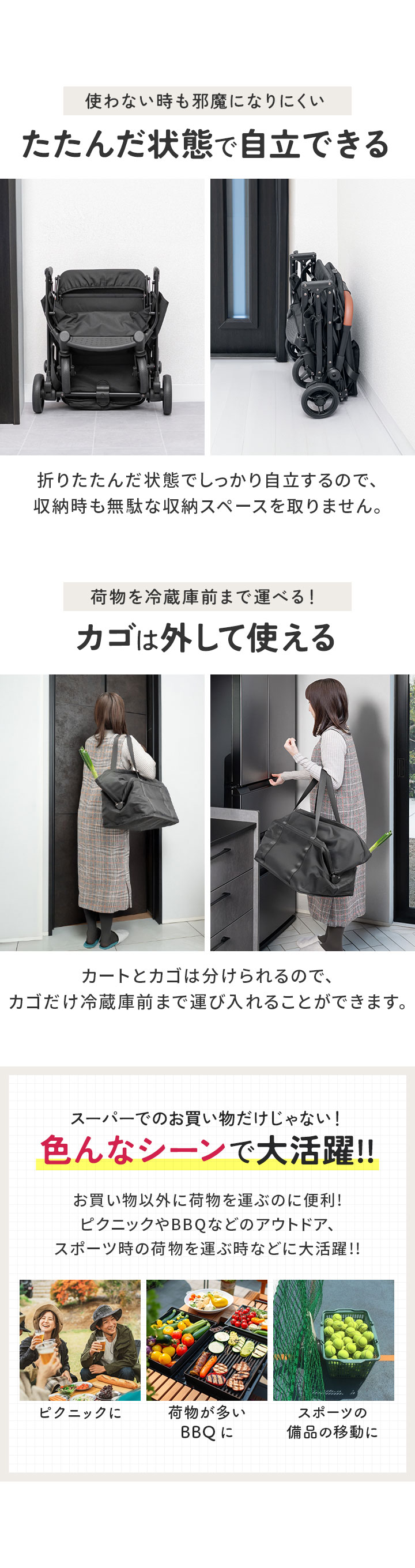 | 特記事項: ・幼児や子供に使用させたり、本製品で遊ばせないでください。事故やケガをするおそれがあります。 ・不安定な場所に置かないでください。転倒してケガや破損の原因となります。 ・組み立て式ですのでしっかりセットして使用してください。使用中にガタついた場合はセットし直してご使用ください。 ・カートを展開後、確実にロックがされているか使用前に確認してください。ロックが外れていると使用中に不意に折りたたまれてしまうおそれがあります。 ・本製品を水につけたり、水のかかる場所で使用しないでください。カビ・変色・変形の原因となります。 ・お手入れに塩素系・酸性タイプ等の洗剤は絶対に使用しないでください。変色や変形したり、有毒ガスの発生により健康を害すことがあります。 ・耐荷重は上段のかご25kg、下段のかご5kgです。耐荷重を超えてのご使用は破損などの原因となりますのでおやめください。 ・展開・収納する際はペットや小さなお子様を近づけないでください。また、指などをはさまないように注意してください。 |