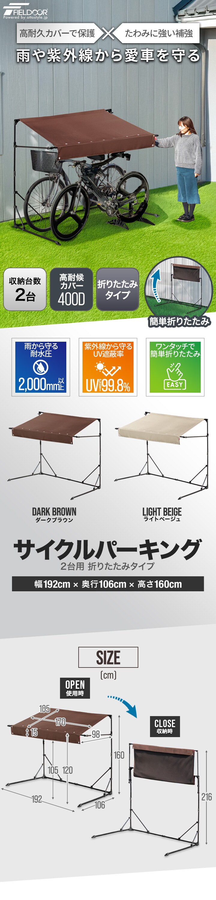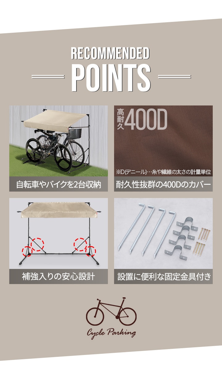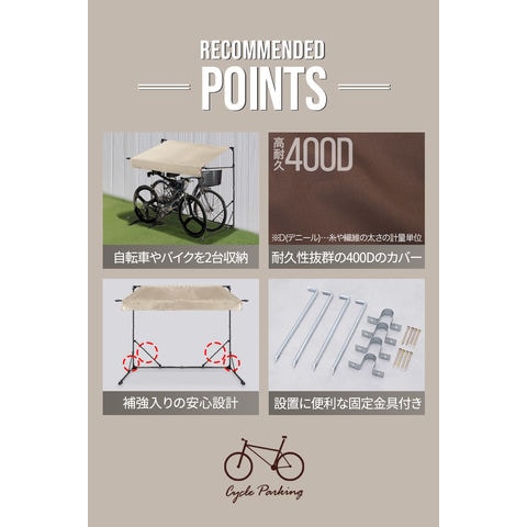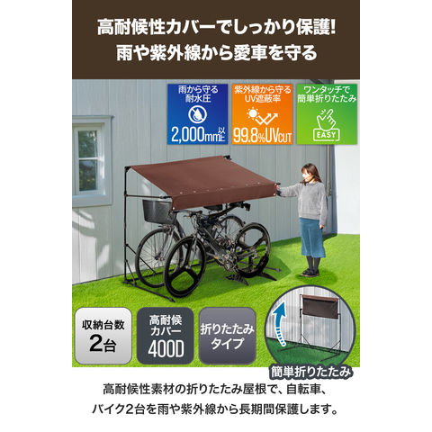 自転車置き場 屋根 サイクルガレージ (ダークブラウン/2台用:奥行106cmタイプ) サイクルパーキング 折りたたみ 日よけ 雨よけ オーニング UVカット 耐水 高耐久 400D カバー 家庭用 DIY 駐輪場 庭 ベランダ 自転車 バイク サイクルポート 送料無料