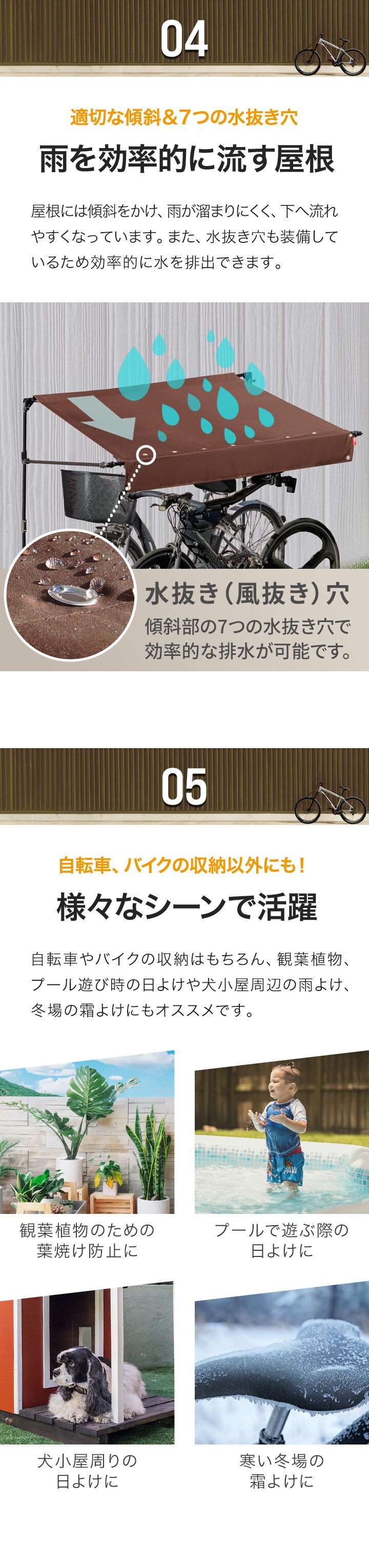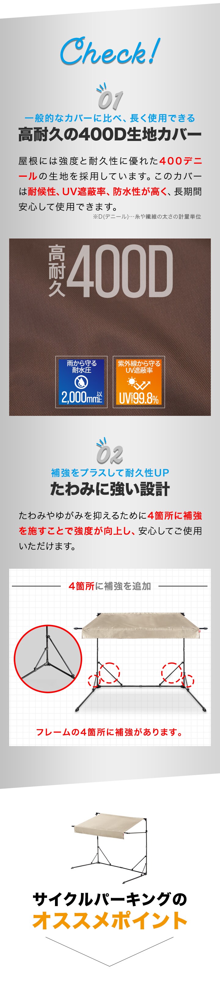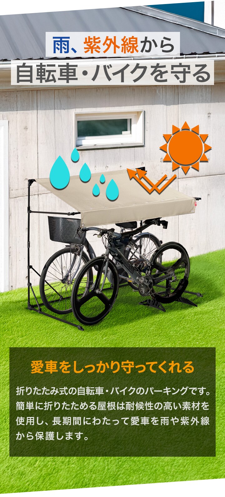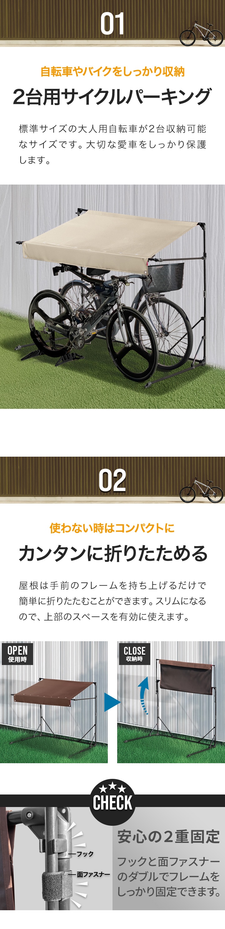 | サイズ: 【1台用】 使用時 : (約)幅192cm×奥行69cm(57cm※屋根の奥行き)×高さ160cm 収納時 : (約)幅192cm×奥行69cm×高さ176cm 【2台用】 使用時 : (約)幅192cm×奥行106cm(98cm※屋根の奥行き)×高さ160cm 収納時 : (約)幅192cm×奥行106cm×高さ216cm 【3台用】 使用時 : (約)幅192cm×奥行134cm(130cm※屋根の奥行き)×高さ160cm 収納時 : (約)幅192cm×奥行134cm×高さ246cm |