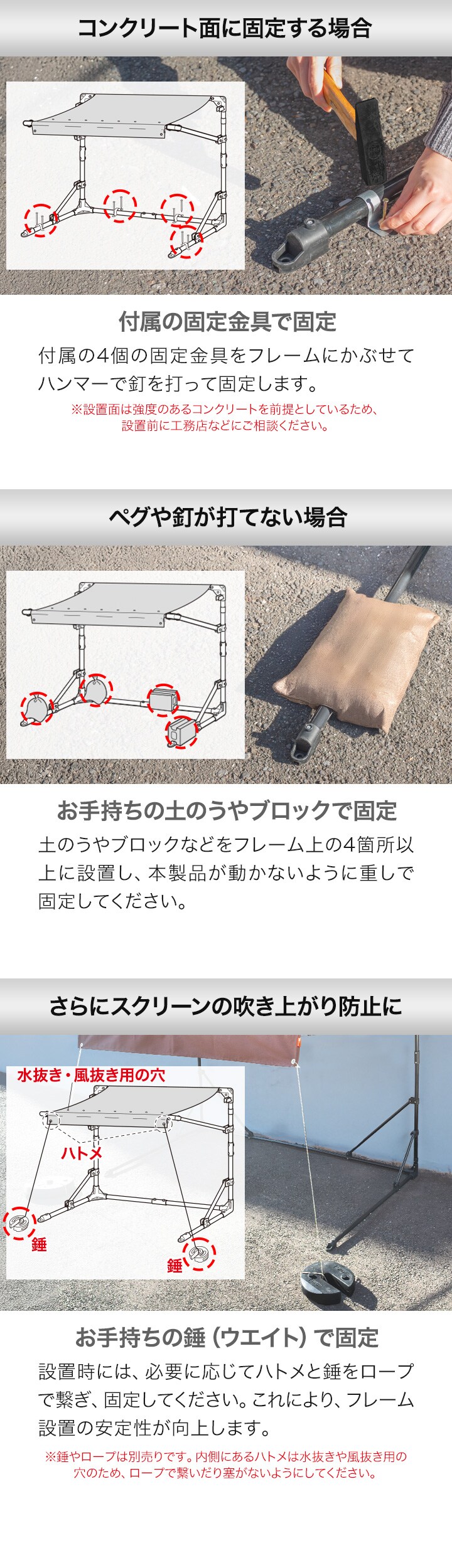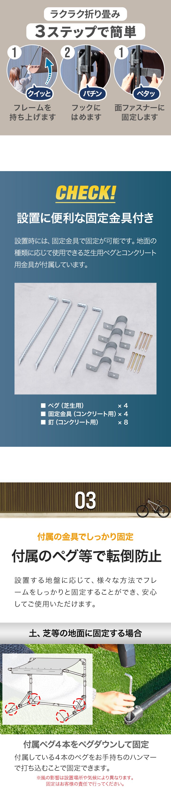 | 付属品: ・ペグ(芝生用)x4 ・固定金具(コンクリート用)x4 ・釘(コンクリート用)x8 ・取扱説明書 |