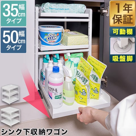 シンク下 収納 ラック 引き出し (幅35cmタイプ) スライド スライドラック キッチン収納 高さ調整 3段 外寸 幅37.5cm 棚 調味料 鍋 フライパン 調理器具 洗面台下 キッチンラック シンク下収納ラック 収納棚 ワゴン 隙間収納 ホワイト 白 送料無料