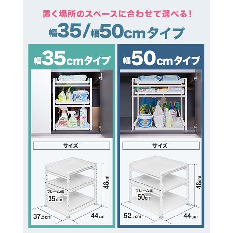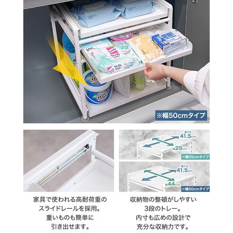 | サイズ: 【幅50cmタイプ】 最大外寸:(約)幅52.5cm×奥行44cm×高さ48cm フレーム外寸:(約)幅50cm×奥行42cm×高さ47cm スライドトレー内寸:(約)幅44cm×奥行41.5cm×高さ4.5cm(前板のみ1.5cm) |