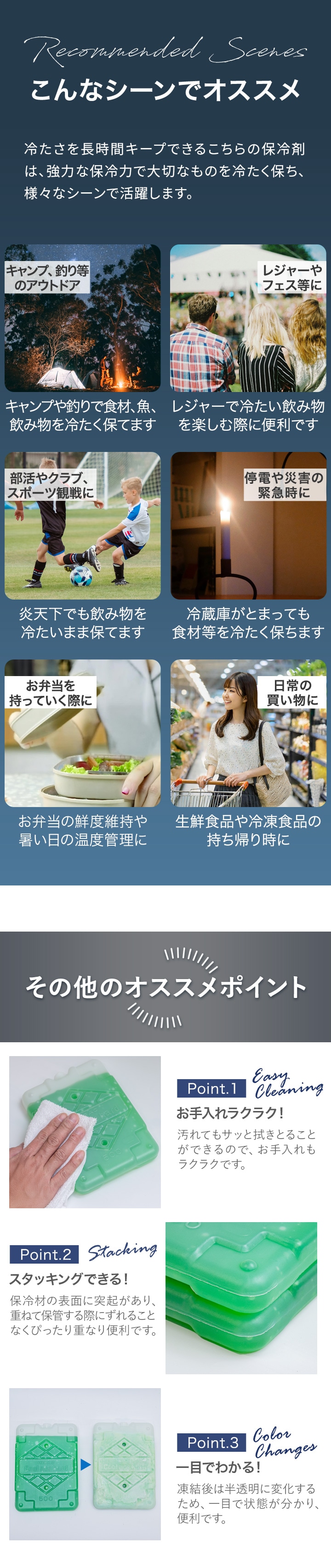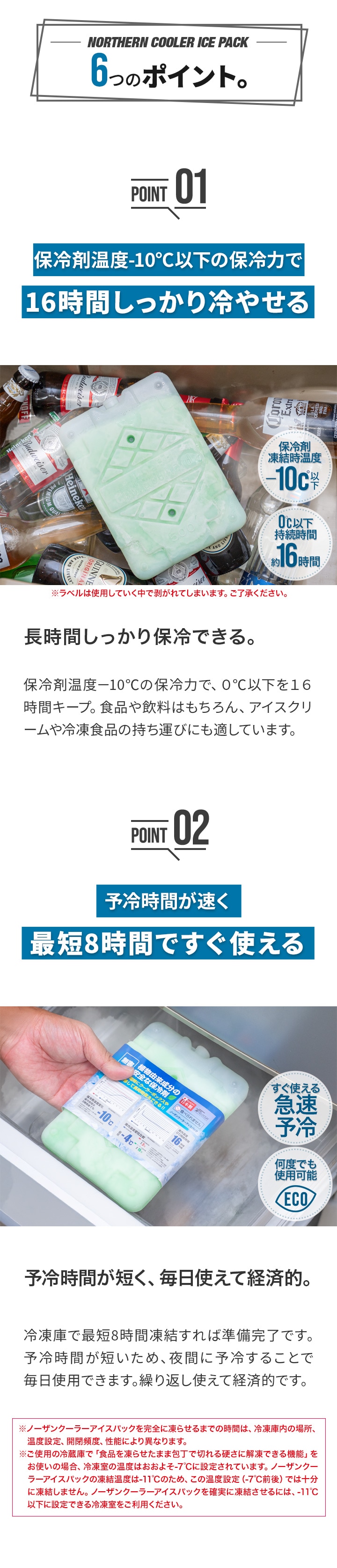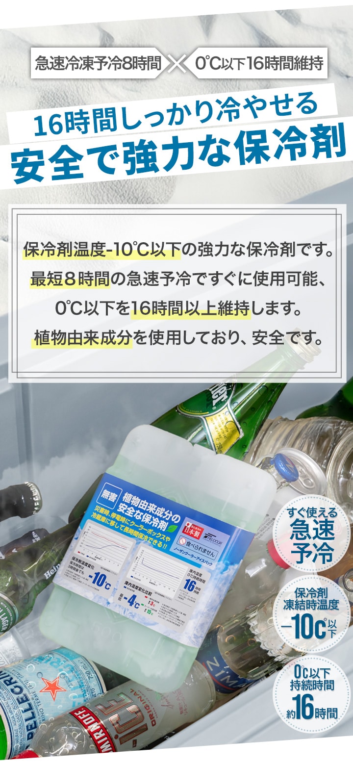 | 特記事項: ※キャップは絶対に開栓しないで下さい。 ※ラベルは使用していく中で剥がれてしまいます。ご了承ください。 ※十分な保冷力を発揮させるために、冷凍庫で完全に凍らせてからご使用ください。(耐冷・耐熱温度-40~50度) ※本製品を完全に凍らせるには冷凍庫で8~12時間(庫内の設定温度による)入れて置く必要があります。 ※完全に凍らせるまでの時間は冷凍庫の温度設定や性能により異なります。 ※冷凍庫の温度設定を最大にしても凍らない場合には庫内温度を下げるため、霜取りや他のものを取り除いて下さい。 ※6リットルのクーラーボックスで本保冷剤1つが目安となります。 ※保冷力はクーラーボックスの性能やふたの開け閉めの頻度により異なります。 ※内側がアルミ蒸着のクーラーボックスに入れて使用しないでください。アルミ蒸着が剥がれる場合があります。 |