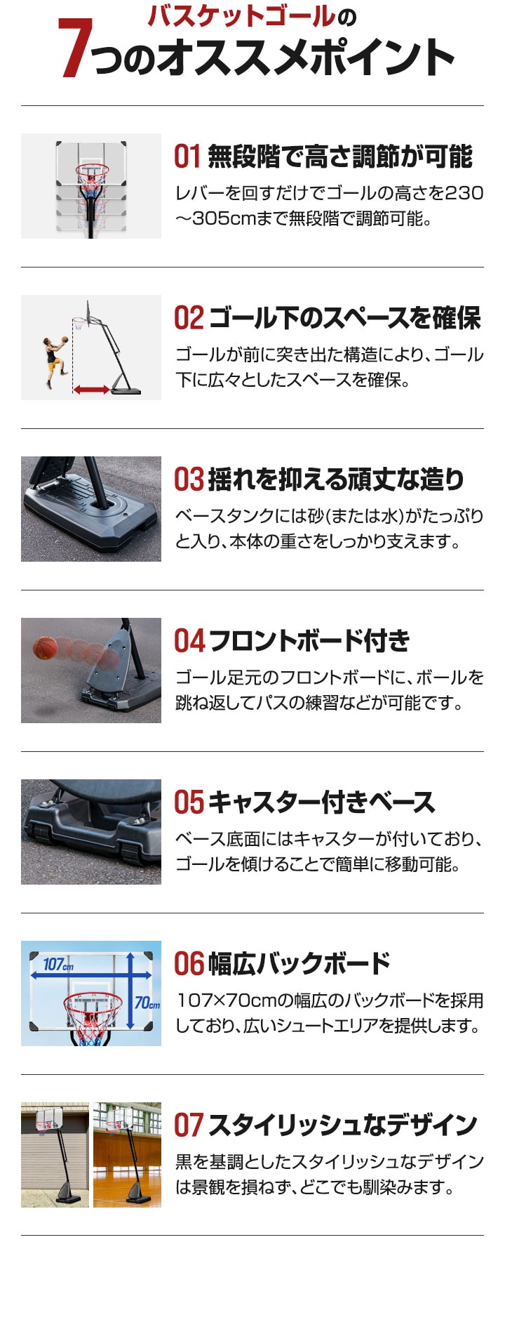 FIELDOOR バスケットゴール 簡単 高さ調整 230cm~305cm 無段階 一般 公式 ミニバス 室内 屋外 家庭用 移動式 練習用 公式サイズ 足元フリー リング 45cm バスケットボール ゴール 5号 6号 7号 対応 工具付 高さ無段階調節タイプ クリスマス 送料無料