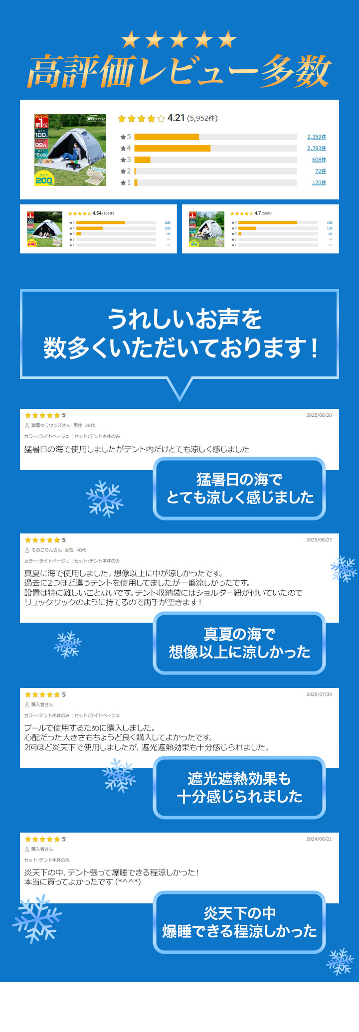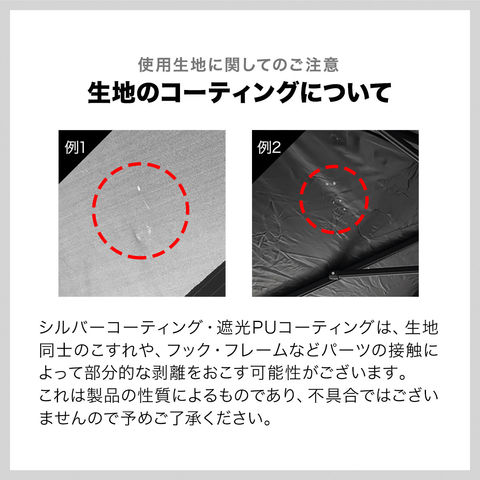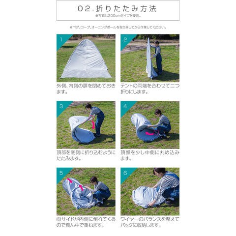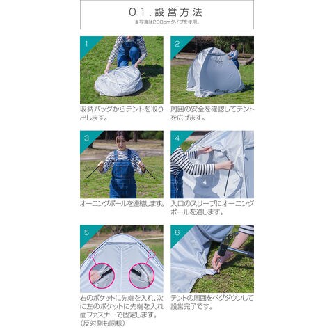 | 付属品: ・テント本体×1 ・収納バッグ×1 ・ペグ×12 ・ロープ×4 ・オーニングポール×2 ・取扱説明書(日本語) |