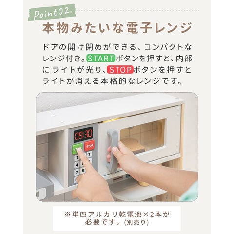 | 電源: ・換気扇…単四アルカリ乾電池×2本 ・電子レンジ…単四アルカリ乾電池×2本 ・コンロ…単三アルカリ乾電池×2本 |