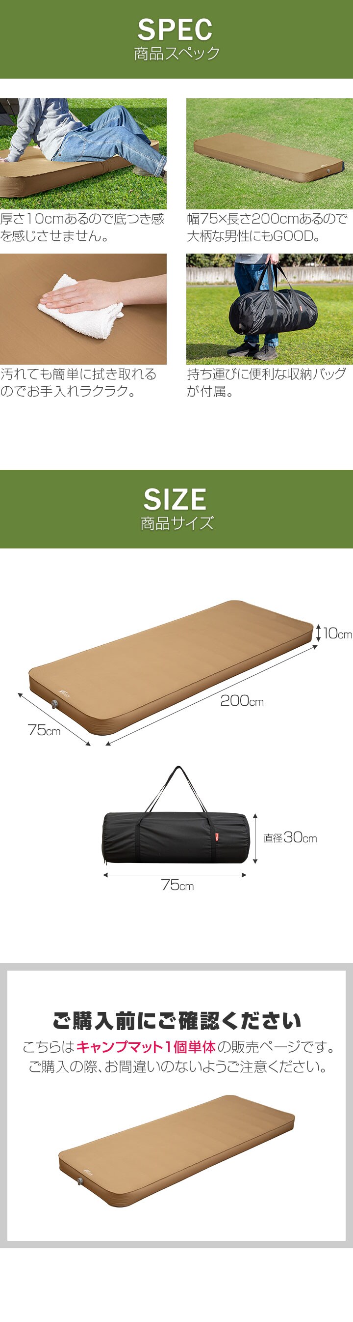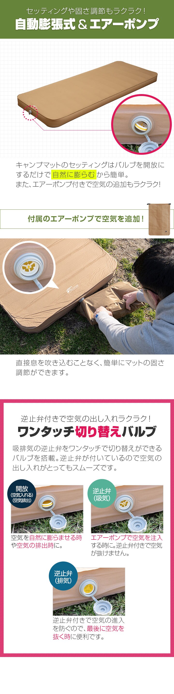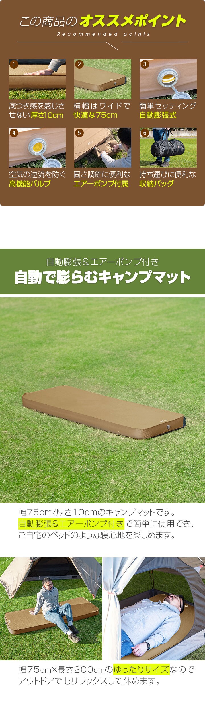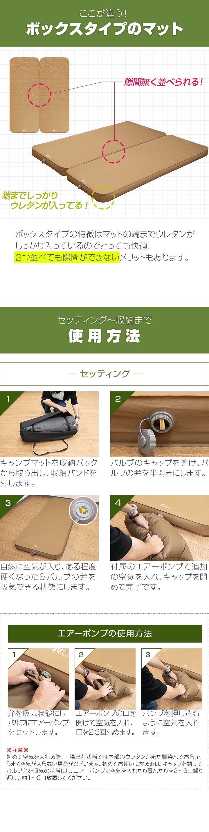 FIELDOOR キャンプマット 厚さ10cm (シングル:幅75cm×200cm/マット1枚のみ) インフレーターブルマット ポンプ付きエアーマット 高密度ウレタン アウトドア寝具 アウトドア テントマット 車中泊マット エアーベッド エアーポンプ付属キャンプマット 送料無料