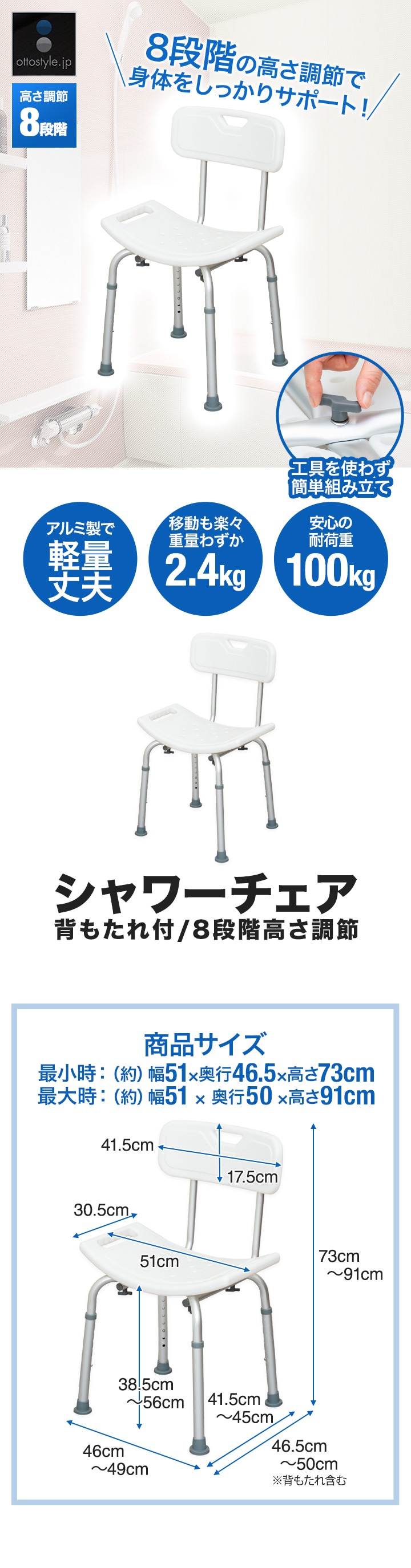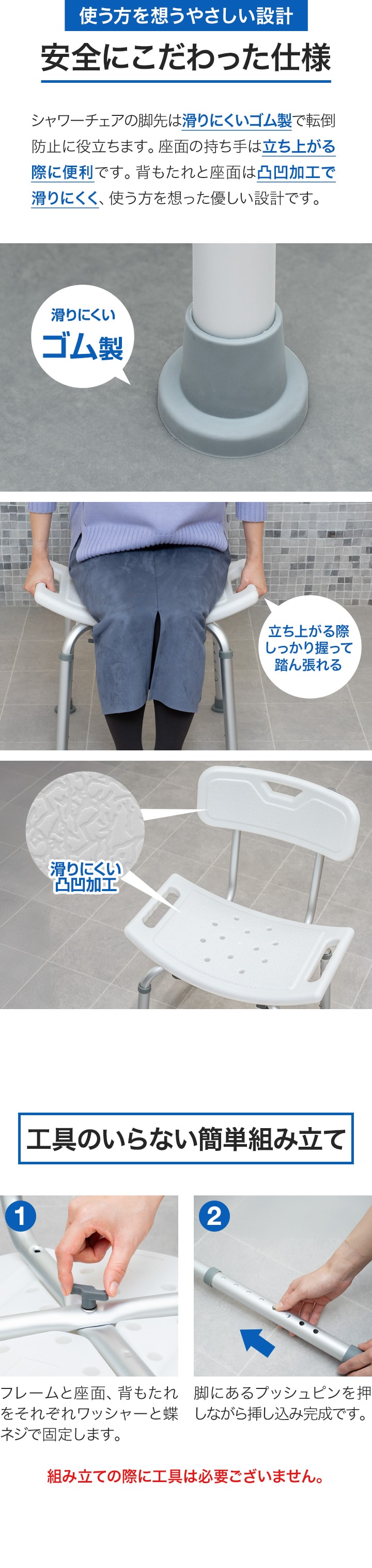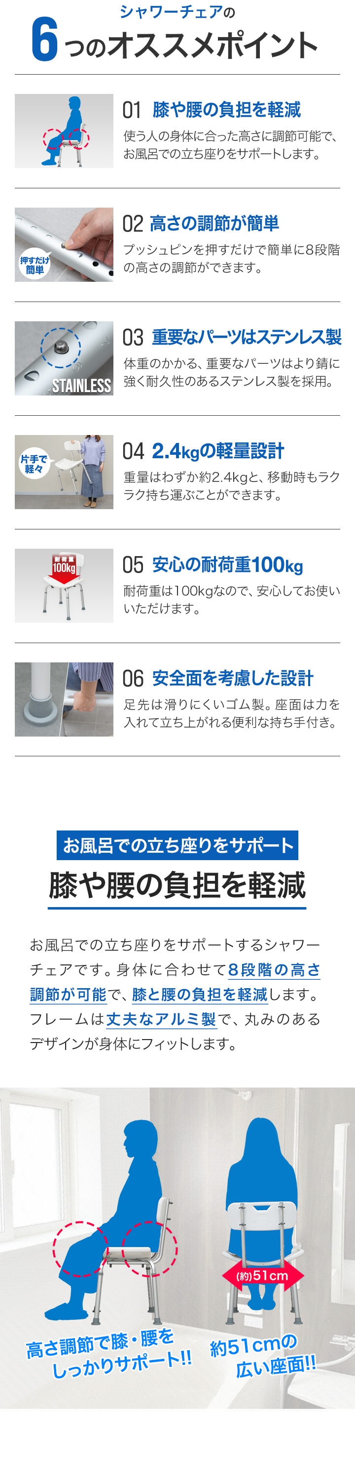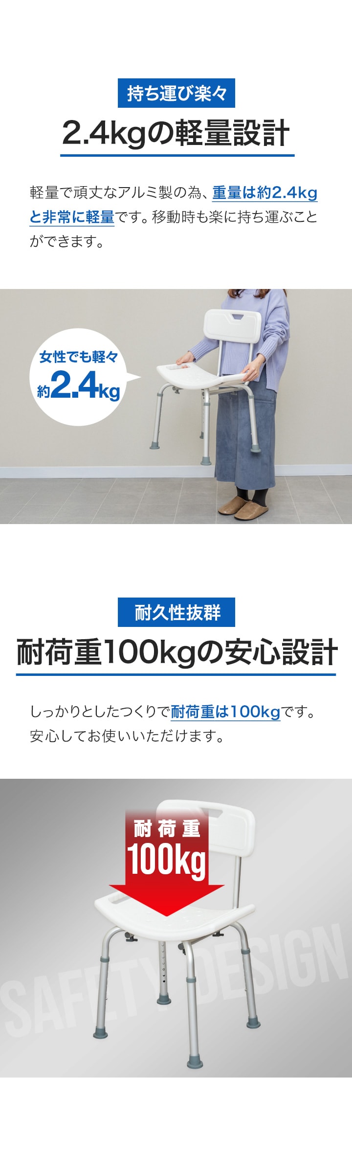 シャワーチェア 介護 お風呂 椅子 シャワー椅子 介護用 バスチェア 背もたれ付き 滑り止め付き 高さ調節 8段階 耐荷重100kg 軽量 アルミ 入浴介助 立ち上がり補助 転倒防止 シャワーチェアー お風呂チェア 風呂イス 介護用品 送料無料