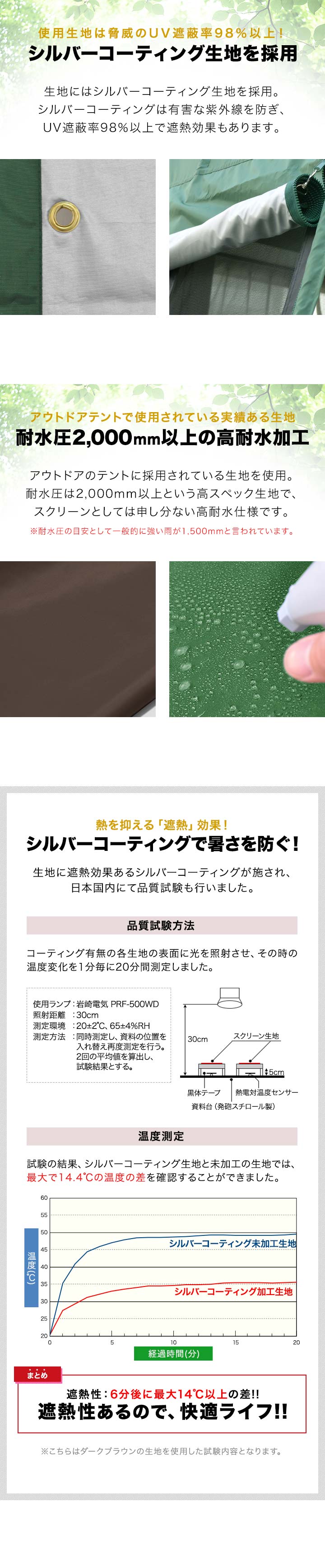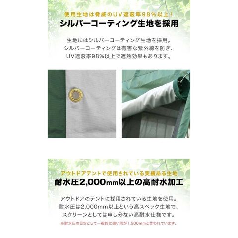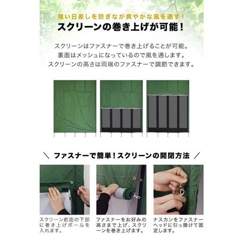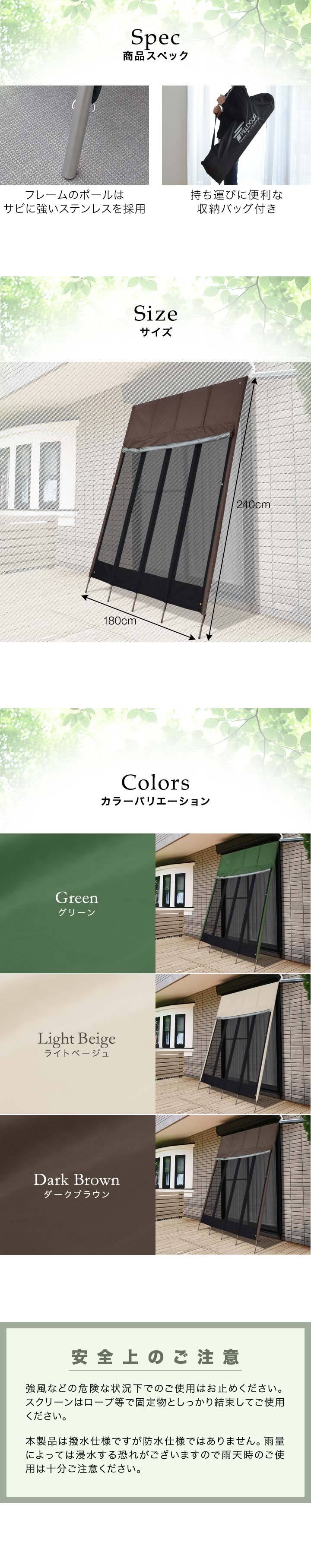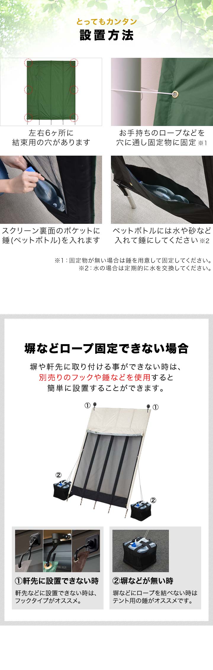 | 特記事項: ※こちらの商品にはロープ・錘は付属いたしません。 ※日よけスクリーンの設置は、必ず固定物と固定、もしくは錘で固定してください。 ※設置は安全のため2人以上で行ってください。 |