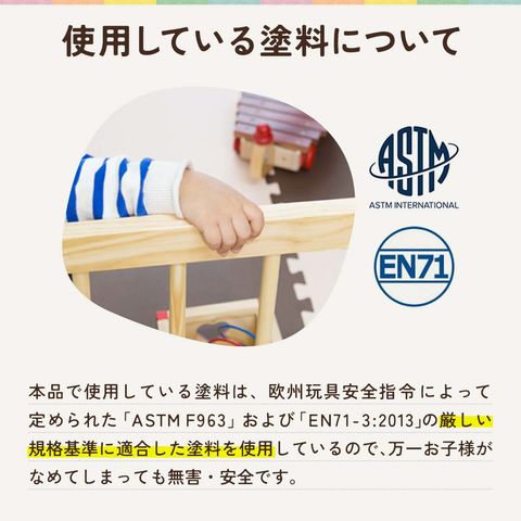 | 特記事項: こちらの商品はお客様組み立てとなります。 ※工具は必要ありません。 ※写真は商品の使用イメージです。ジョイントマットやおもちゃ等は付属いたしません。 ※底面のクッションにシリコンを利用してる為、材質の特性上、接触・摩擦により床材へ色移りすることがありますので、ご注意ください。 |