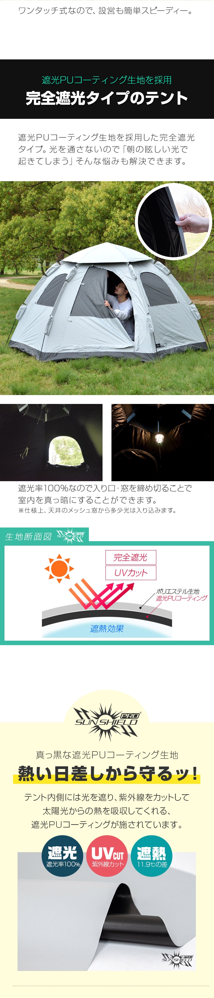 FIELDOOR テント ワンタッチ (グレー/テント本体のみ) 4人用 5人用 完全遮光 3m×2.5m ヘキサゴン 簡単 ワンタッチテント 遮熱 UVカット 耐水圧16,000mm ドームテント 軽量 グラスファイバー フルクローズ キャンプテント キャンプ アウトドア 簡易テント 送料無料