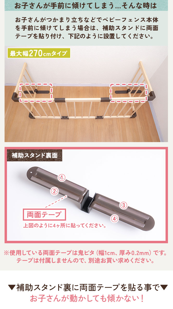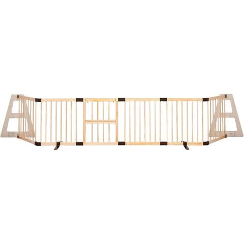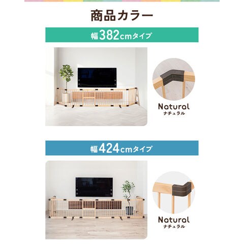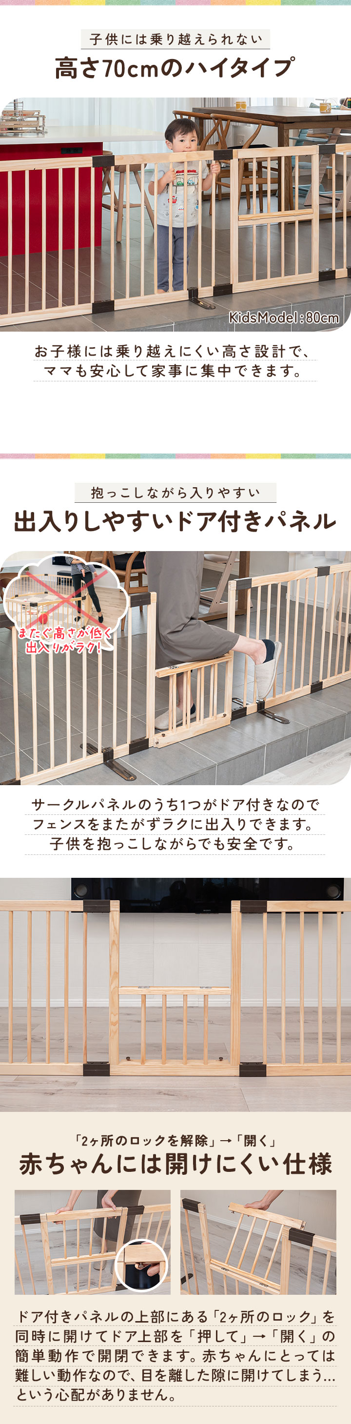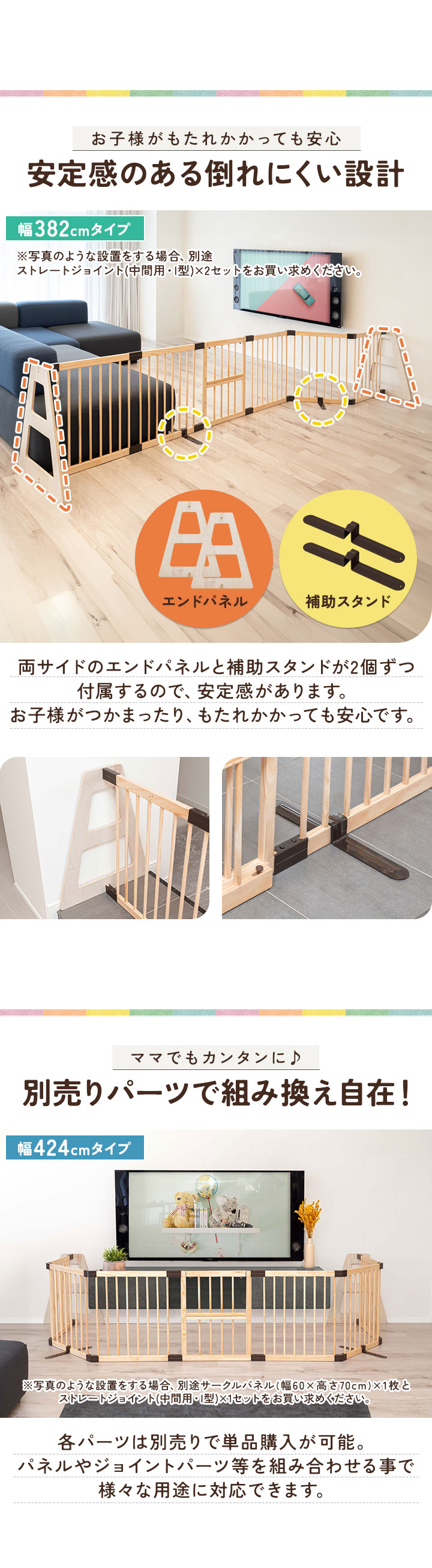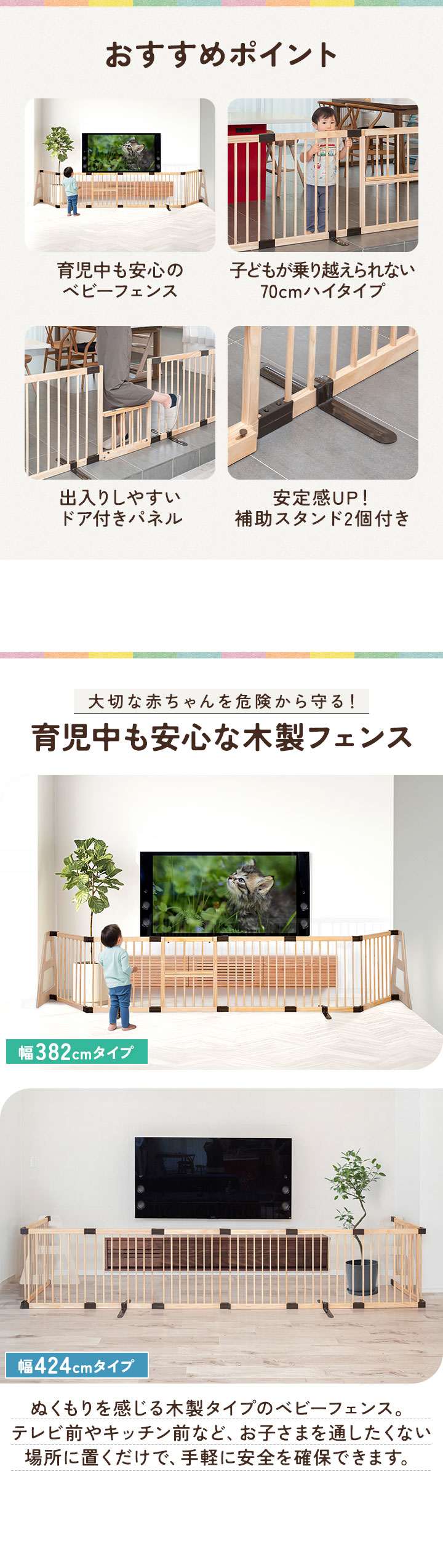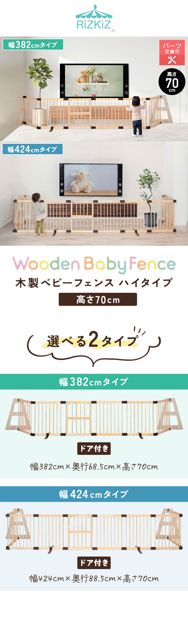 RiZKiZ ベビーフェンス (幅382cm/スタンド2本付) ドア&エンドパネル付き 木製 置くだけ 高さ70cm ハイタイプ 自立式 補助スタンド付き 天然木 簡単設置 組み立て式 テレビガード 階段 台所 キッチン リビング パーテーション ベビーゲート ベビーサークル 柵 安全 送料無料