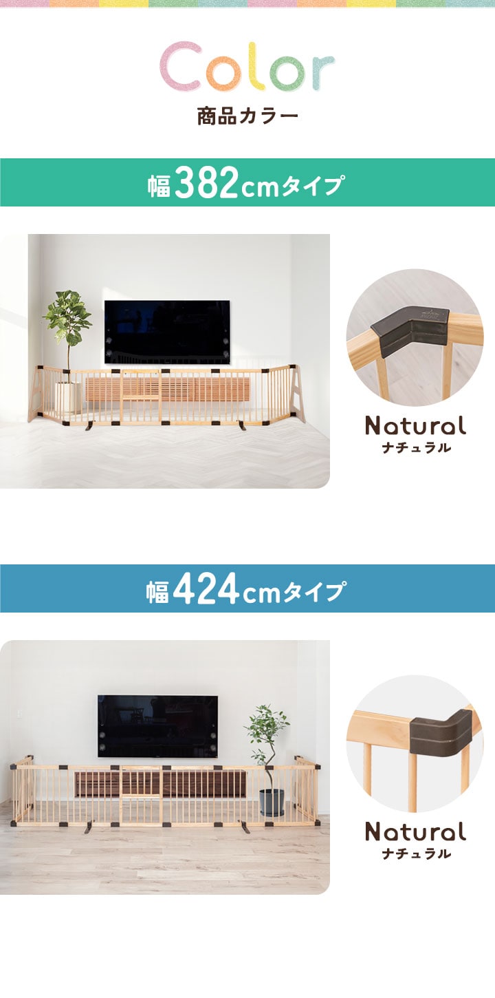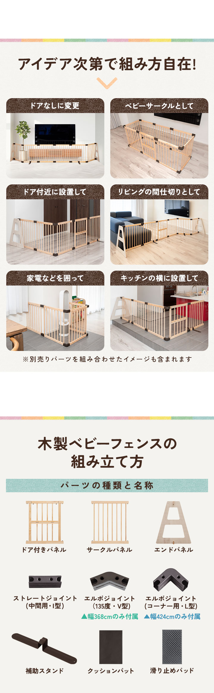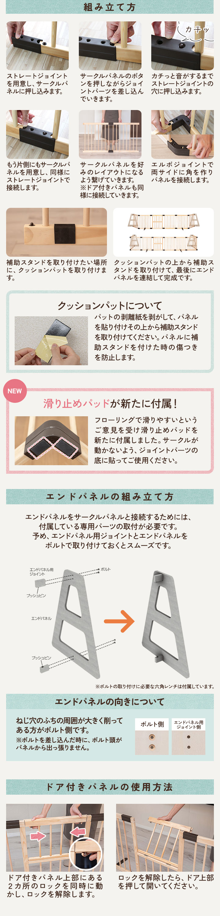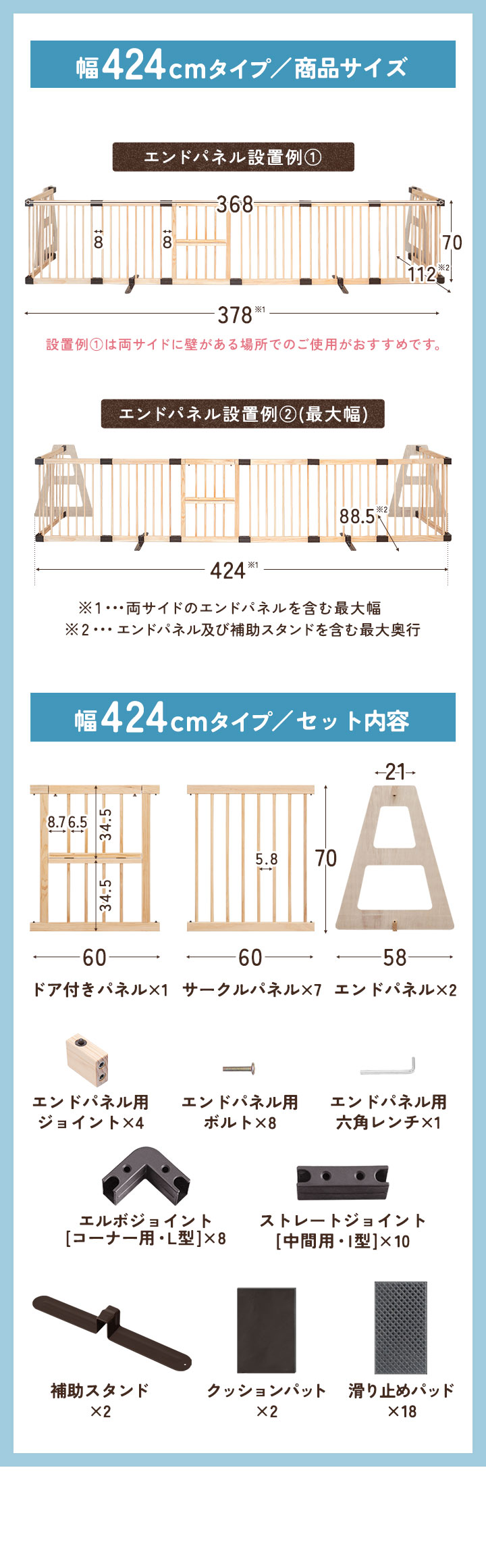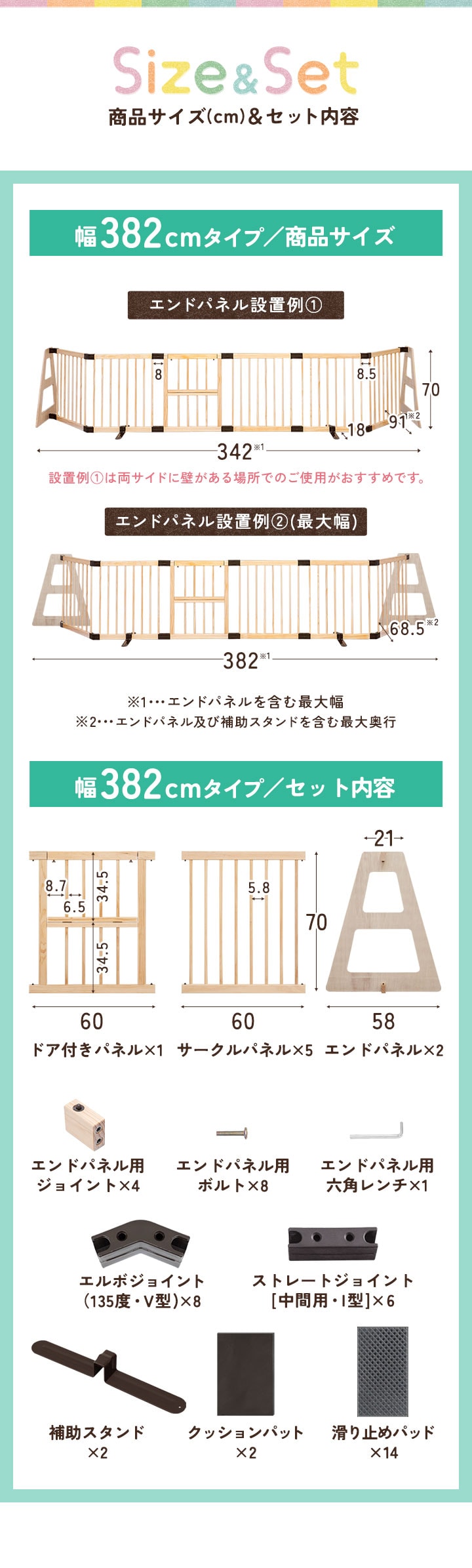 | セット内容: 【幅382cmタイプ】 ・サークルパネル×5 ・ドア付きパネル×1 ・エンドパネル×2 ・エンドパネル用ジョイント×4 ・エンドパネル用ボルト×8 ・エンドパネル用六角レンチ×1 ・エルボジョイント(135度・V型)×8 ・ストレートジョイント(中間用・I型)×6 ・補助スタンド×2 ・クッションパット×2 ・滑り止めパッド×14 【幅424cmタイプ】 ・サークルパネル…7 ・ドア付きパネル…1 ・エンドパネル×2 ・エンドパネル用ジョイント×4 ・エンドパネル用ボルト×8 ・エンドパネル用六角レンチ×1 ・エルボジョイント(コーナー用・L型)×8 ・ストレートジョイント(中間用・I型)×10 ・補助スタンド×2 ・クッションパット×2 ・滑り止めパッド×18 |