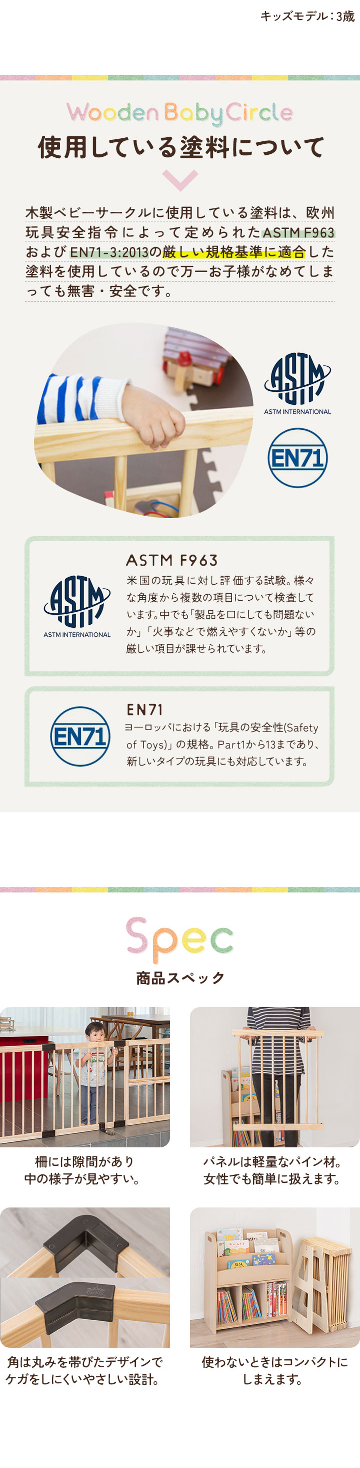 | 材質: ・サークルパネル…パイン材(松の木) ・ジョイントパーツ…PP樹脂 ・エンドパネル…プライウッド ・補助スタンド…スチール |