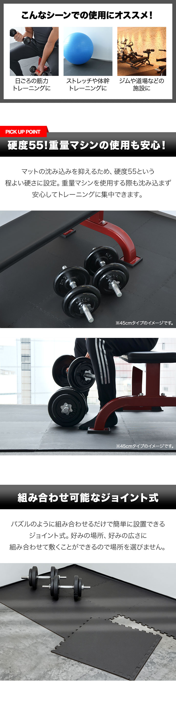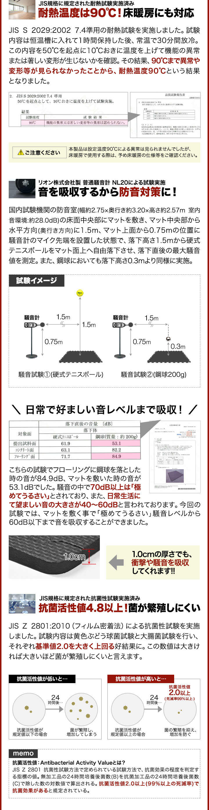 | 特記事項: ※サイドパーツ単体の販売は行っておりません。サイドパーツをカットして使用する際はご注意ください。 ※長期間の使用など、ご使用の環境によって商品の色が床材の表面に色移りする場合がありますのでご注意ください。 ※EVA樹脂の臭いが最初はある程度しますが、人体には影響ありません。臭いによる返品はお受けできませんので、臭いの気になる方はその旨をご了承の上ご購入をお願いします。 |